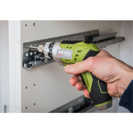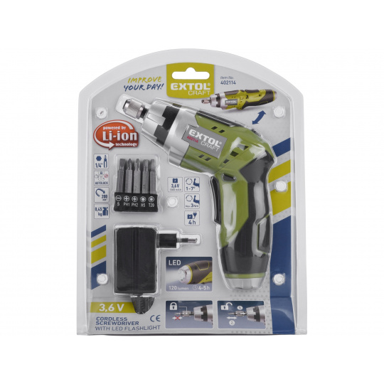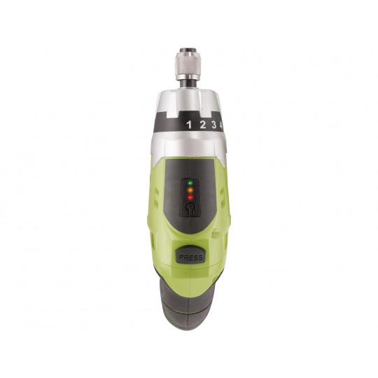 Praktický aku šroubovák určený pro utahování či povolování šroubů a matic. Při použití vrtáků se šestihrannou stopkou můžete i vrtat. Díky snadnému nastavení momentů při utahování už nikdy nepoškodíte šrouby nebo závity a s otočnou rukojetí se dostanete do méně přístupných míst. Aku šroubovák je vybaven brzdou rotoru, proto ho lze omezeně použít i při vybité baterii. Díky Li-ion akumulátoru je možné šroubovák kdykoliv dobíjet, aniž by se tím snižovala kapacita akumulátoru. Li-ion akumulátor ztrácí energii vlivem samovybíjení velmi pomalu a vydrží dlouho nabitý.
