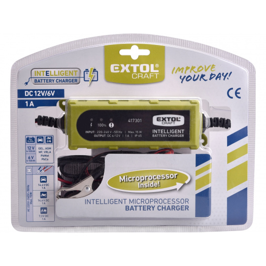 Malá nabíječka bez ovládacích tlačítek s nabíjecím proudem 1A a s 4+1 fázemi nabíjení, které jsou automaticky řízeny mikroprocesorem, je určena k nabíjení všech typů 6 a 12V olověných (Pb) akumulátorů především s nižší kapacitou, tj. např. ve skútrech, motorkách, elektrocentrálách s elektrickým startem apod., které s ohledem na svou živostnost není žádoucí nebo je nebezpečné je nabíjet vyšším nabíjecím proudem použitím např. mikroprocesorové nabíječky určené pro autobaterie. Vzhledem k velikosti nabíjejícího proudu je tato nabíječka vhodná zejména pro ty, kteří mají kromě autobaterií také olověné akumulátory s nižší kapacitou, pro jejichž nabití je nutný menší nabíjející proud. V případě autobaterií a jiných 12 V olověných akumulátorů s vyšší kapacitou slouží tato nabíječka jako udržovací nabíječka s dlouhodobým připojením k olověnému akumulátoru, kdy je vozidlo delší dobu odstaveno z provozu a akumulátor tak není pravidelně dobíjen jízdou vozidla, např. v zimním období. Fáze nabíjení 1 - DETECTION: určení typu připojeného akumulátoru a zjištění úrovně jeho nabití 2 - SOFT START: pozvolný náběh nabíjecího proudu 3 - BULK: proces nabíjení 4 - BATTERY TEST: vyhodnocení stavu nabití akumulátoru 5 - FLOAT: udržení konstantního napětí udržovacím pulzním proudem