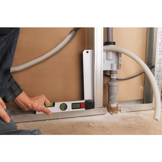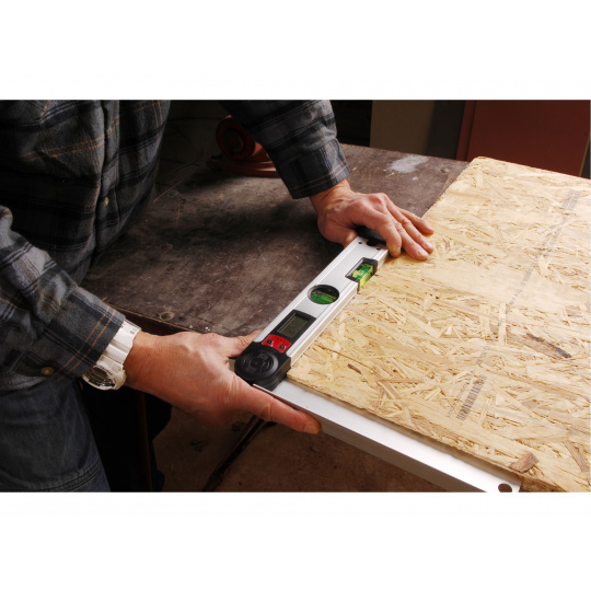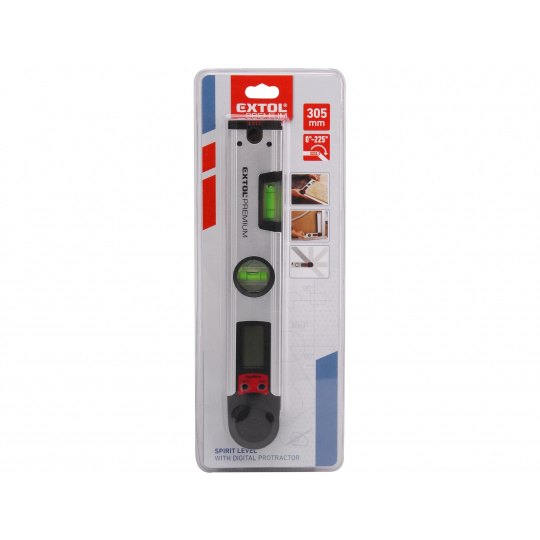 dvoulibelová vodováha, přesnost: 0,5mm/1m, 2 libely 0°a 90°, úhloměr: rozsah měření 0-225°s rozlišením 0,1° a přesností ±0,3°