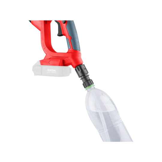 Aku tlakový čistič je určen k tlakovému čištění vodou s max. tlakem 22bar, čímž se řadí mezi střednětlaké čističe. Díky napájení z baterie a funkci samosávání vody můžete jednoduše kamkoliv přijít a snadno omýt např. cyklistické kolo, auto, chodník či terasu, zahradní nábytek, omyvatelnou fasádu, nebo při nastavení sprchy zalévat květiny. Čistič lze připojit rychlospojkou na klasickou zahradní hadici propojenou na vodovodní rozvod nebo použít přiloženou hadici se sacím košem a použít volně přístupnou zásobu vody (s kbelíku, řeky, jezera, sudu s dešťovou vodou...). Při napájení z vodovodního řádu lze aku vapku použít také i bez baterie, avšak výstupní tlak vody z trysky bude výrazně nižší. S přiloženým adaptérem lze v nouzi použít také vodu z běžné PET láhve. Díky nízké spotřebě vody lze čistič velmi dobře používat i s menším objemem vody. Stroj je vybaven multifunkční tryskou s 6nastavitelnými typy paprsků: přímý 0˚, vějíř 15˚, 25˚, 40˚, boční paprsek pod úhlem 45˚ pro mytí třeba střechy nebo podvozku auta a sprchy, kterou lze využít třeba pro zalévání květin. Pro zvýšení účinnosti čištění lze k čističi připojit šamponovací adaptér se zásobní nádobkou na čistící prostředek určený pro tlakové vodní čističe pro nízkotlaké nanesení čistícího prostředku (proces šampónování) a poté se čistící prostředek po určité době od nanesení opláchne čistou tlakovou vodu. Díky připojení hadice v zadní části čističe nebude tolik překážet při práci. Pro běžnou práci dostačují jeden nebo dva 2000mAh akumulátory, které můžete rychle nabít v rychlonabíječce, pro náročnější nebo delší práci doporučujeme větší akumulátory s kapacitou 4000–8000mAh. Akumulátor lze použít ve všech typech nářadí řady EXTOL SHARE20V. Díky použité Li-ion technologii je ho možné kdykoliv dobíjet, aniž by se tím snižovala jeho kapacita. Li-ion akumulátor ztrácí energii vlivem samovybíjení velmi pomalu a vydrží dlouho nabitý a připravený k použití.