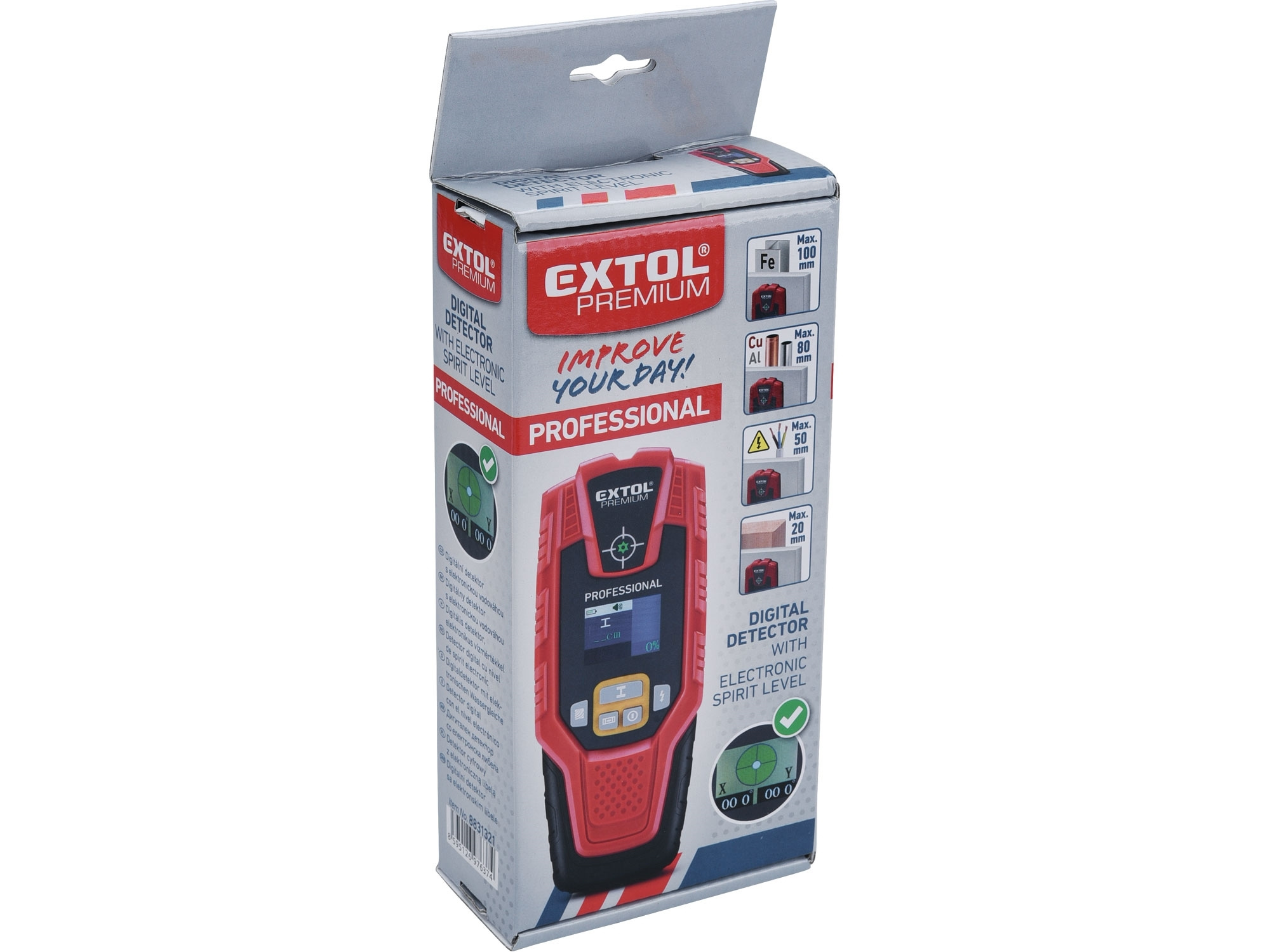 hloubka detekce: železné kovy 100mm, neželezné kovy (měď) 80mm, měděné vodiče pod napětím 50mm, dřevo 20mm, baterie 1x9V typ 6F22