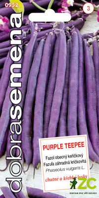 PURPLE TEEPEE - keříčkový fazol s výrazně fialovými lusky. Má tmavý až nafialovělý list a pevnou rostlinu. Lusky jsou nasazeny nad listy a lehce se sklízí. Na průřezu jsou kulaté, bez pergamenové blány.