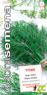 Titan - nenáročný, mohutně rostoucí a výrazně aromatický kopr. Olistění je husté a tmavě zelené. Výnosná a spolehlivá odrůda pro kuchyňskou úpravu, konzervaci i k sušení. Vegetační doba je 70 - 80 dnů.