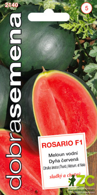 ROSARIO F1 - vodní meloun se středně velkými plody o hmotnosti 3 - 4 kg s jasně červenou, výrazně sladkou dužinou.  Vyžaduje záhřevné polohy s jižní expozicí a humózní půdu s dostatkem živin. Půdu můžete před výsadbou nastlat černou netkanou textilií.