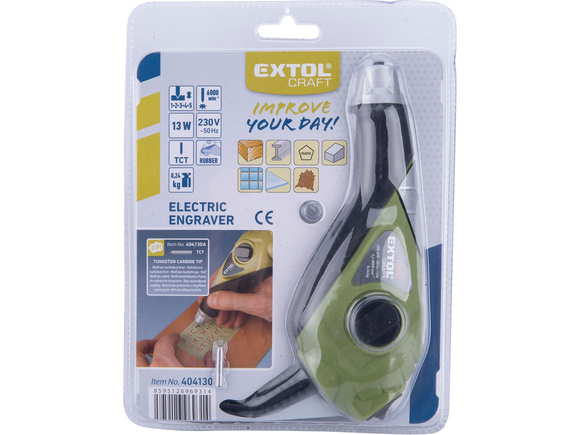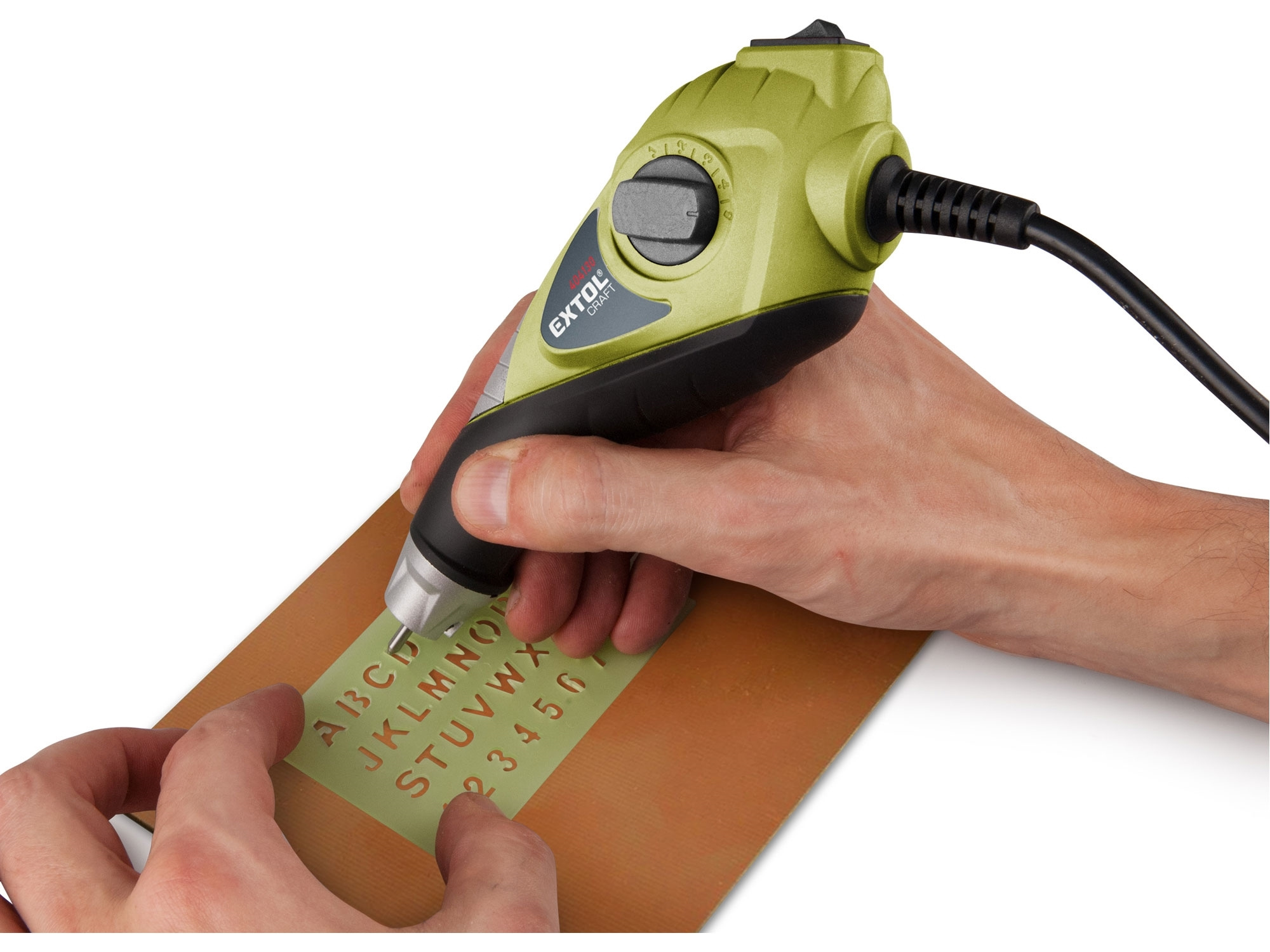 kadence úderů 6000/min, gravírovací hrot - karbid wolframu, pro materiály do tvrdosti 58 HRC (dřevo, sklo, plast, měkké kovy, ocel atd.), el. regulace hloubky - ano