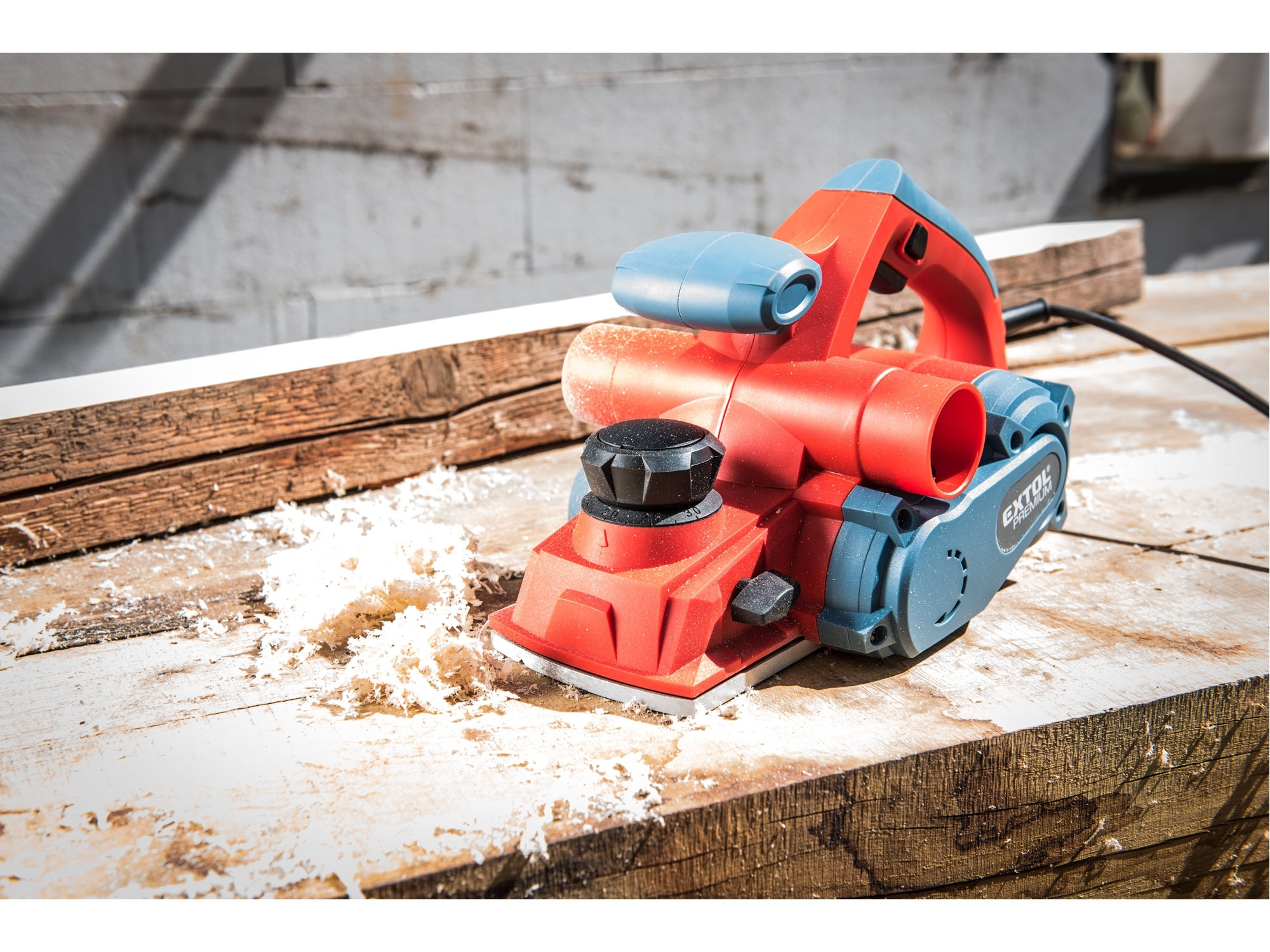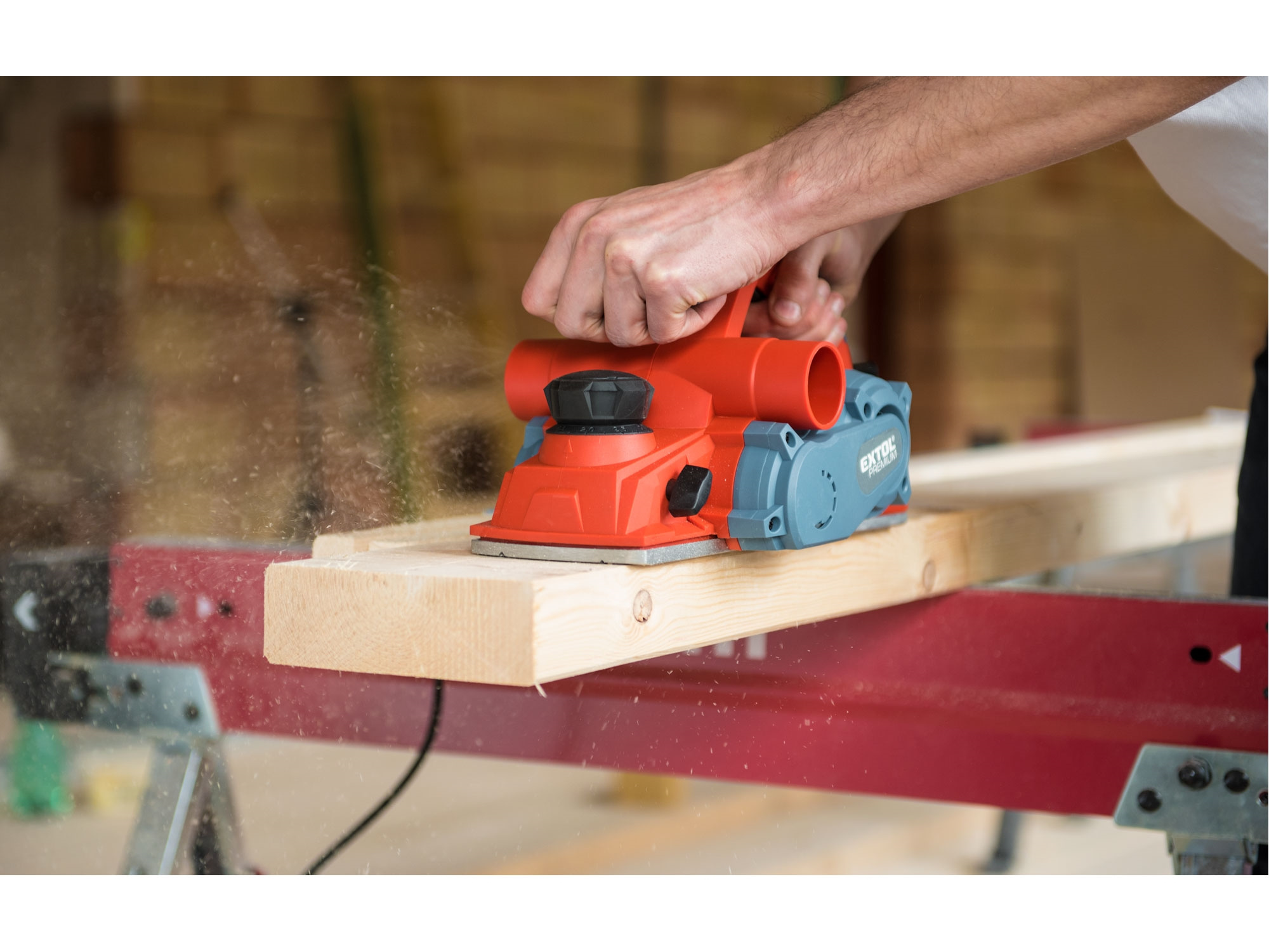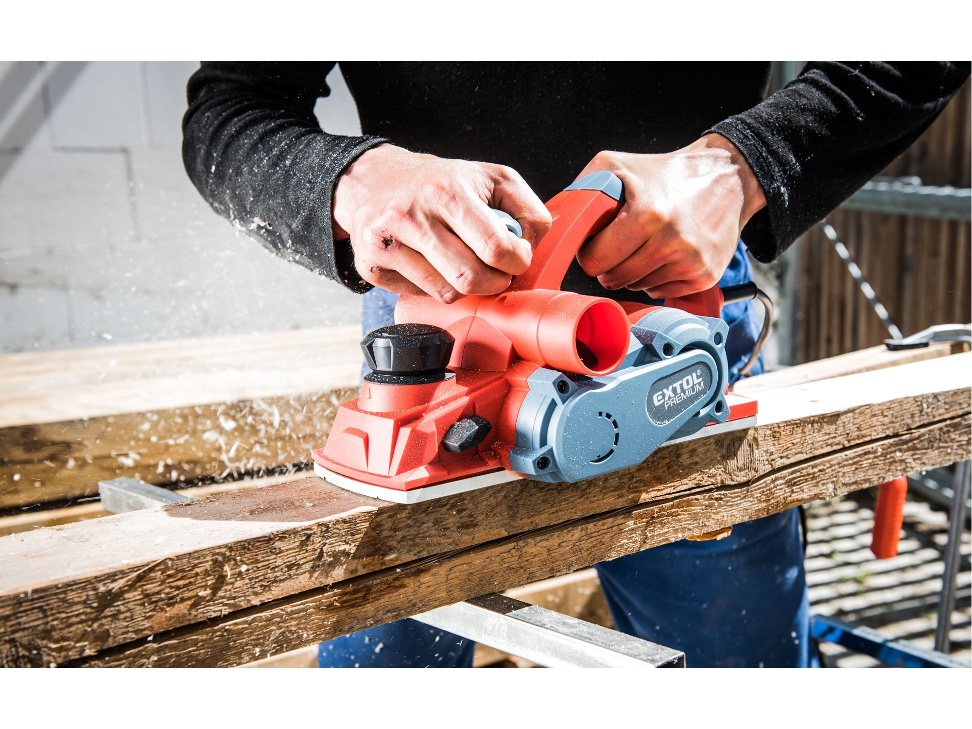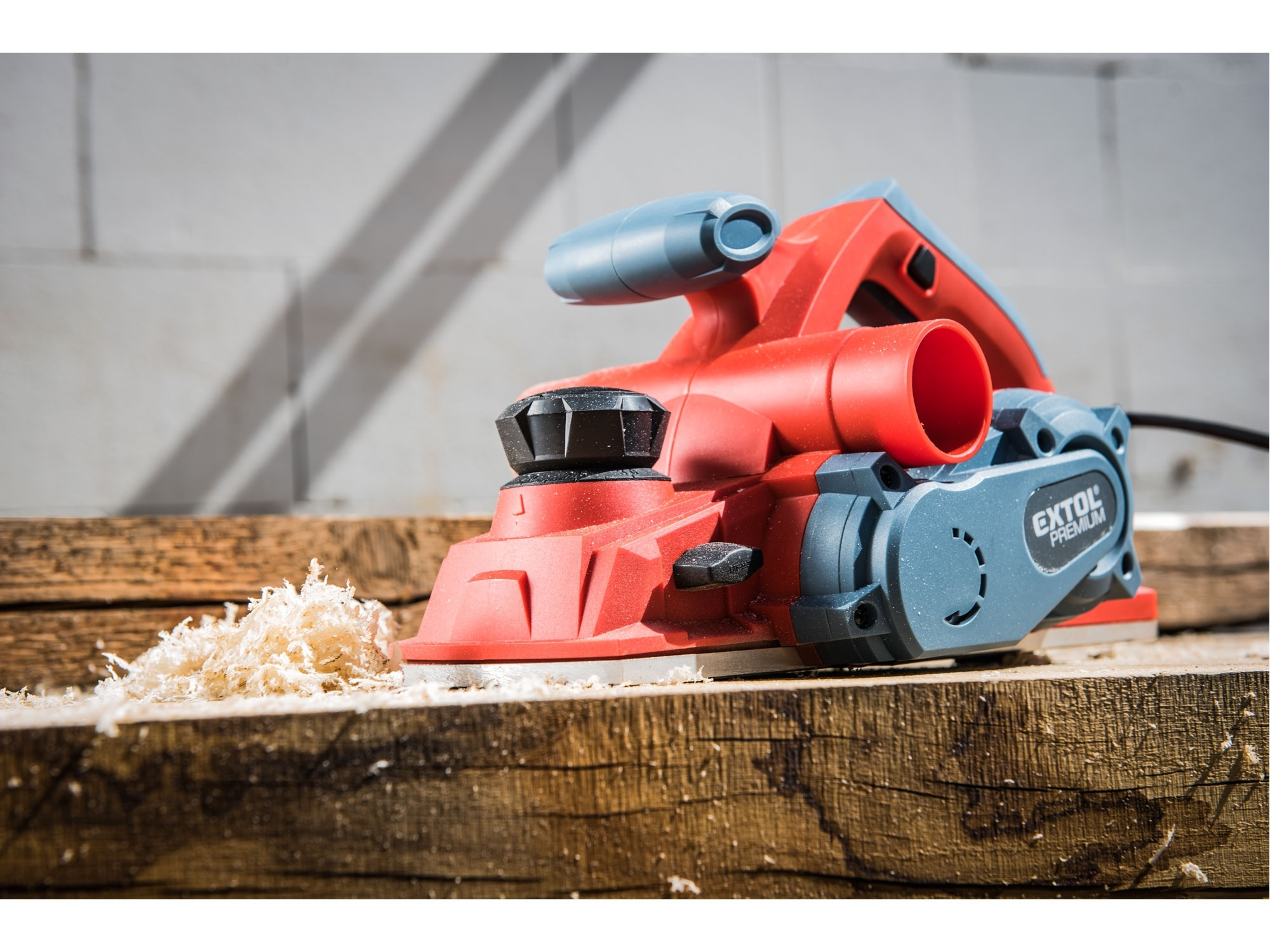 Velmi silný hoblík s hoblovací šířkou 110mm je určen k hoblování, srážení a drážkování dřeva, např. trámů a prken. Můžete s ním hoblovat 0-3mm při jednom protahu a hloubka úběru se nastavuje po 0,25mm. Při hoblování polodrážek můžete využít rozsah 0 až 8mm. Na hoblovací desce jsou dvě různě hluboké drážky sloužící k jednoduchému srážení hran a sklopný ochranný trn, který chrání při přerušení práce, nože a plochu pod hoblíkem proti poškození. Pokud preferujete práci bez tohoto ochranného trnu, můžete ho jednoduše zajistit v desce, aby se nevyklápěl. Pro udržování čistého pracovního prostoru lze k hoblíku připojit odsávání z pravé nebo levé strany.