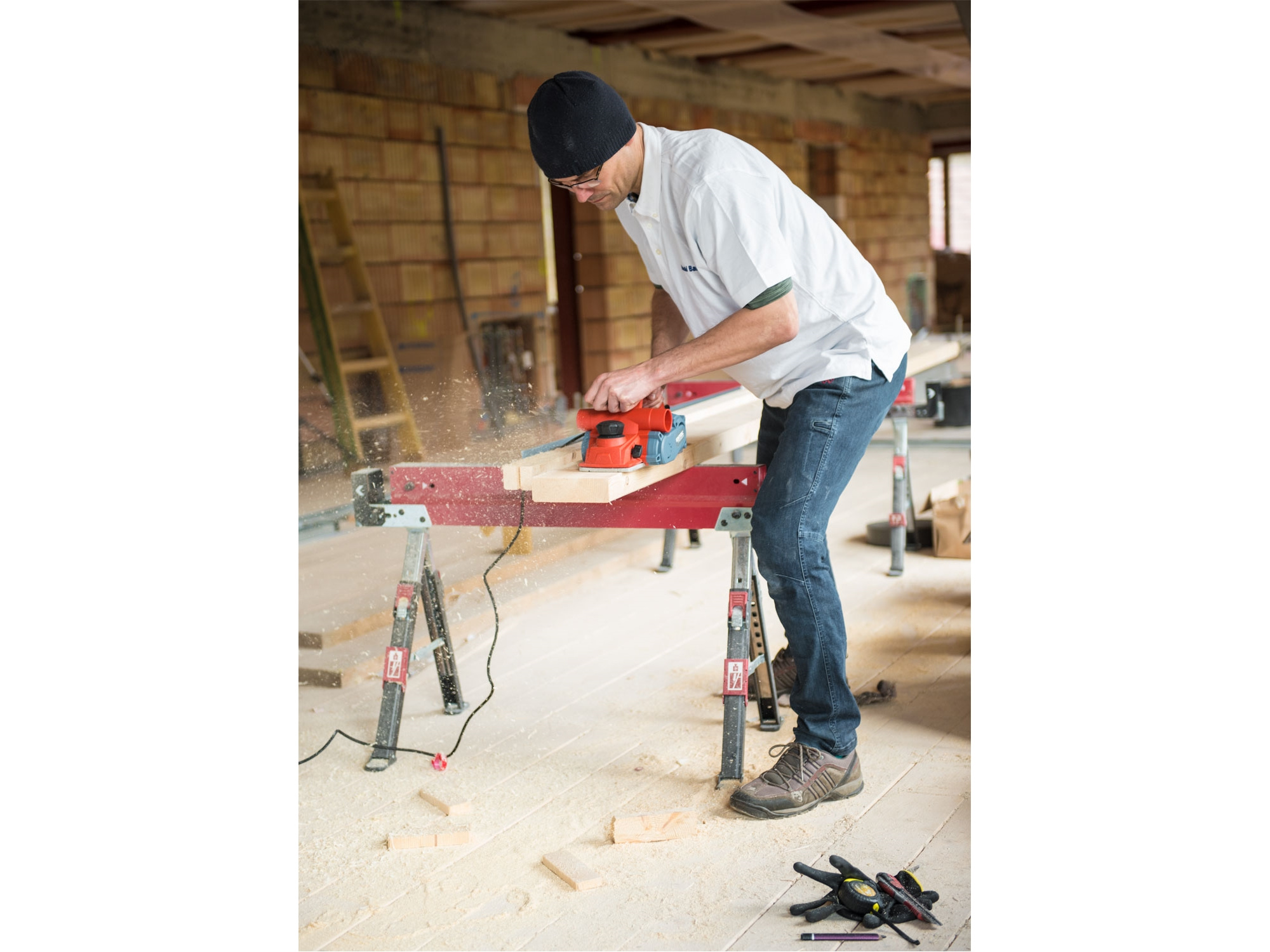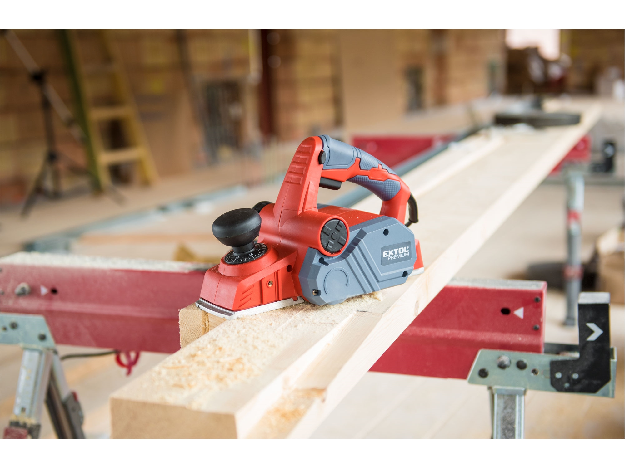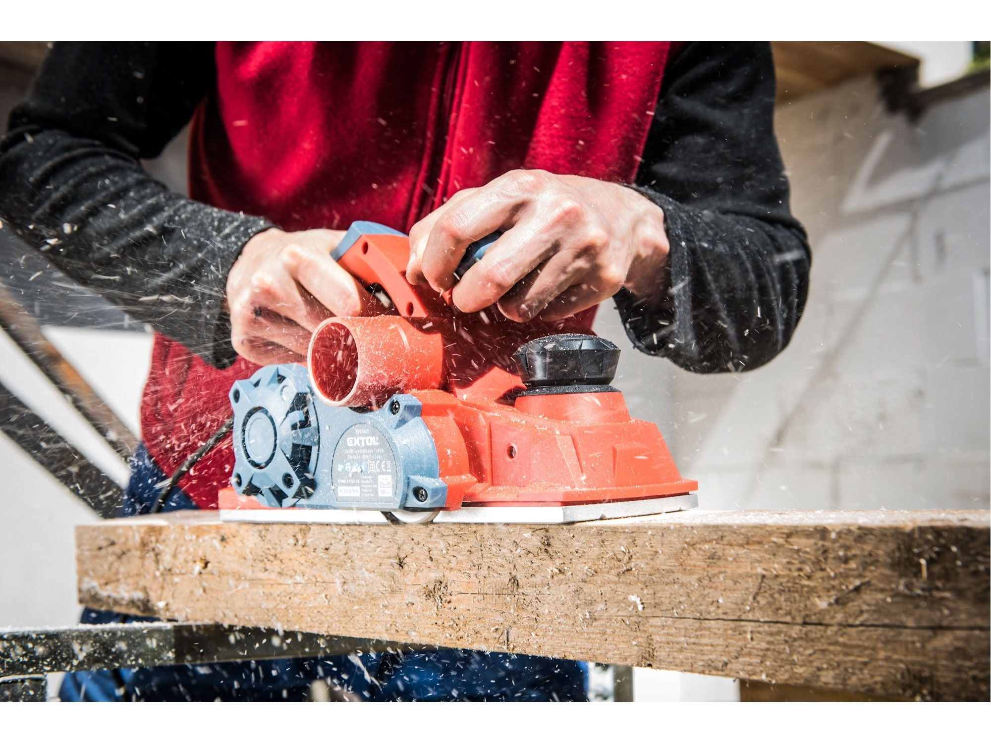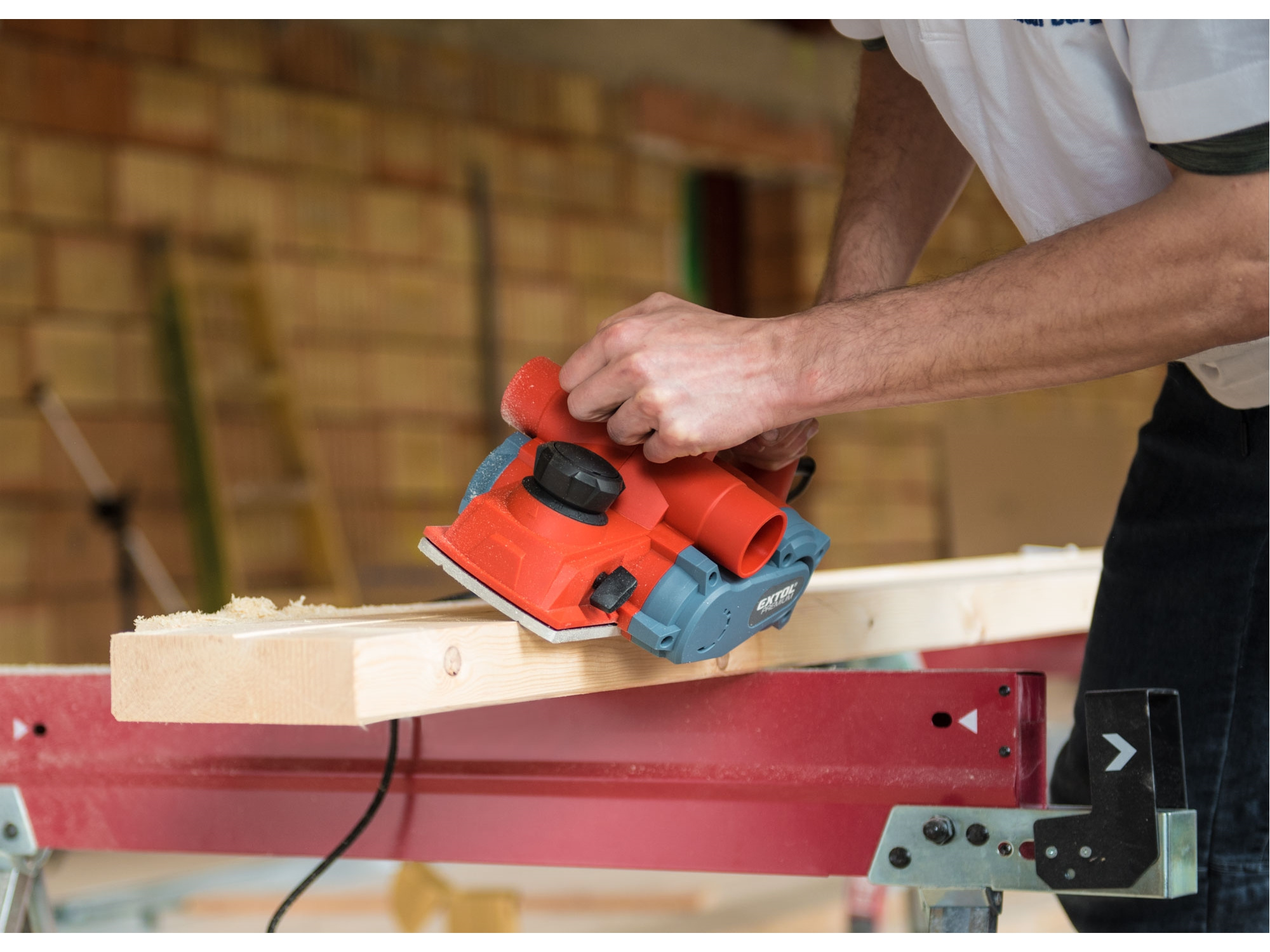 Velmi silný hoblík s hoblovací šířkou 110mm je určen k hoblování, srážení a drážkování dřeva, např. trámů a prken. Můžete s ním hoblovat 0-3mm při jednom protahu a hloubka úběru se nastavuje po 0,25mm. Při hoblování polodrážek můžete využít rozsah 0 až 8mm. Na hoblovací desce jsou dvě různě hluboké drážky sloužící k jednoduchému srážení hran a sklopný ochranný trn, který chrání při přerušení práce, nože a plochu pod hoblíkem proti poškození. Pokud preferujete práci bez tohoto ochranného trnu, můžete ho jednoduše zajistit v desce, aby se nevyklápěl. Pro udržování čistého pracovního prostoru lze k hoblíku připojit odsávání z pravé nebo levé strany.