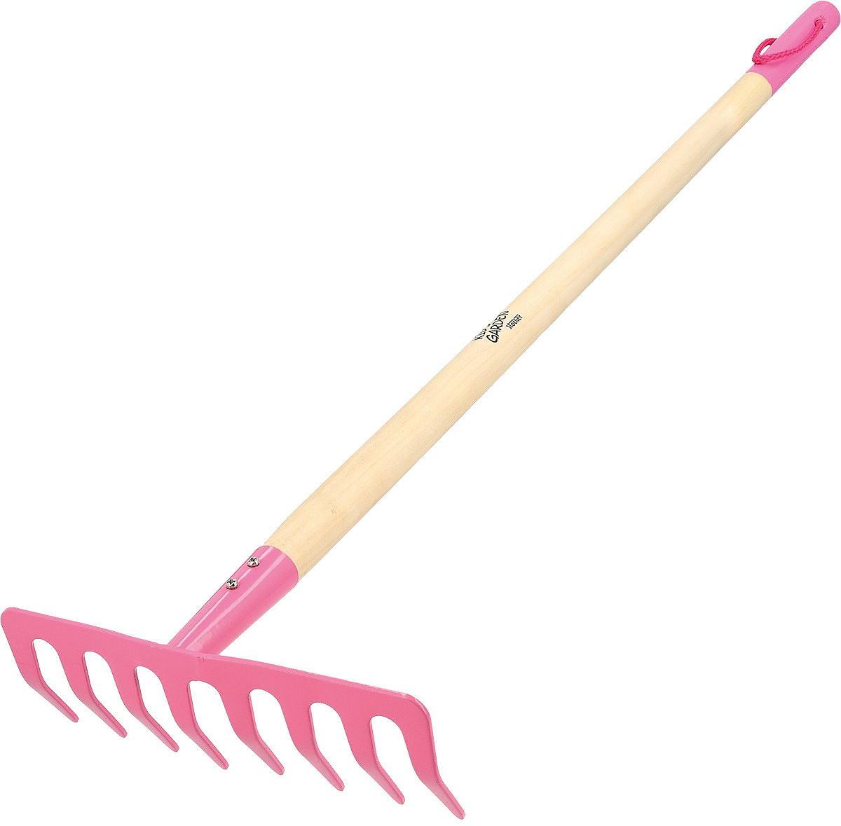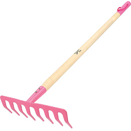 Velmi kvalitní a plně funkční dětské hrabičky v růžové barvě s dřevěnou násadou. Ideální pro zapojení malých dětí do zahradnických činností jako je hrábaní listí nebo urovnání půdy.
