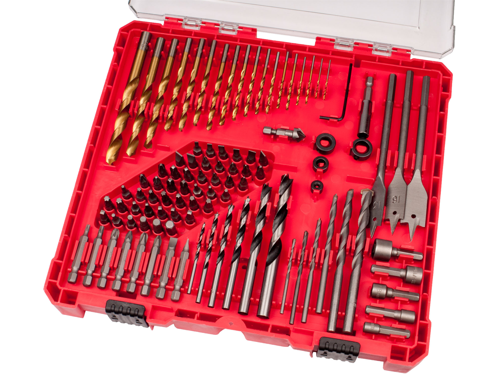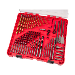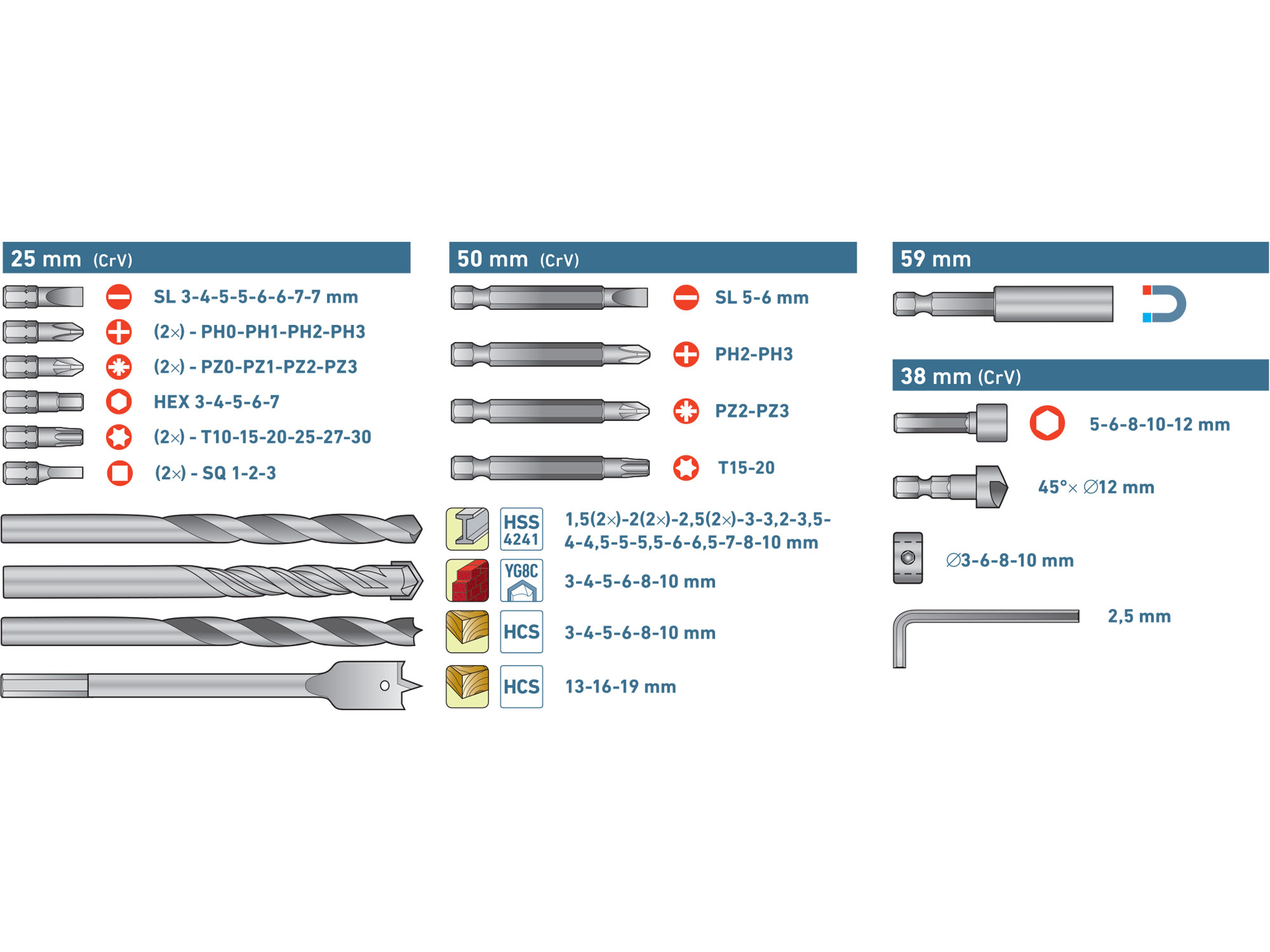 vrtáky do kovu(HSS-4241) : O 1,5-1,5-2-2-2,5-2,5-3-3,2-3,5-4-4,5-4,8-5-5,5-6-6,5-7-8-10mm; vrtáky do dřeva(HCS): O 3-4-5-6-8-10-13-16-19mm; vrtáky do zdiva(SK-YG8C): O 3-4-5-6-8-10mm; hroty 1/4"x25mm: (-) 3-4-5-5-6-6-7-7mm, PH0-0-1-1-2-2-3-3, PZ0-0-1-1-2-2-3-3, HEX H3-4-5-6-7mm, TORX T10-10-15-15-20-20-25-25-27-27-30-30, SQ 1-1-2-2-3-3; hroty 1/4"x50mm: (-) 5-6mm, PH2-3, PZ2-3, T15-20; nástrčné hlavice (38mm): 5-6-8-10-12mm; magnet.nástavec na hroty 1/4"x59mm; záhlubník 1/4"x45°x12mm; hloubk. dorazy k vrtákům O3-6-8-10mm; L-imbus 2,5mm