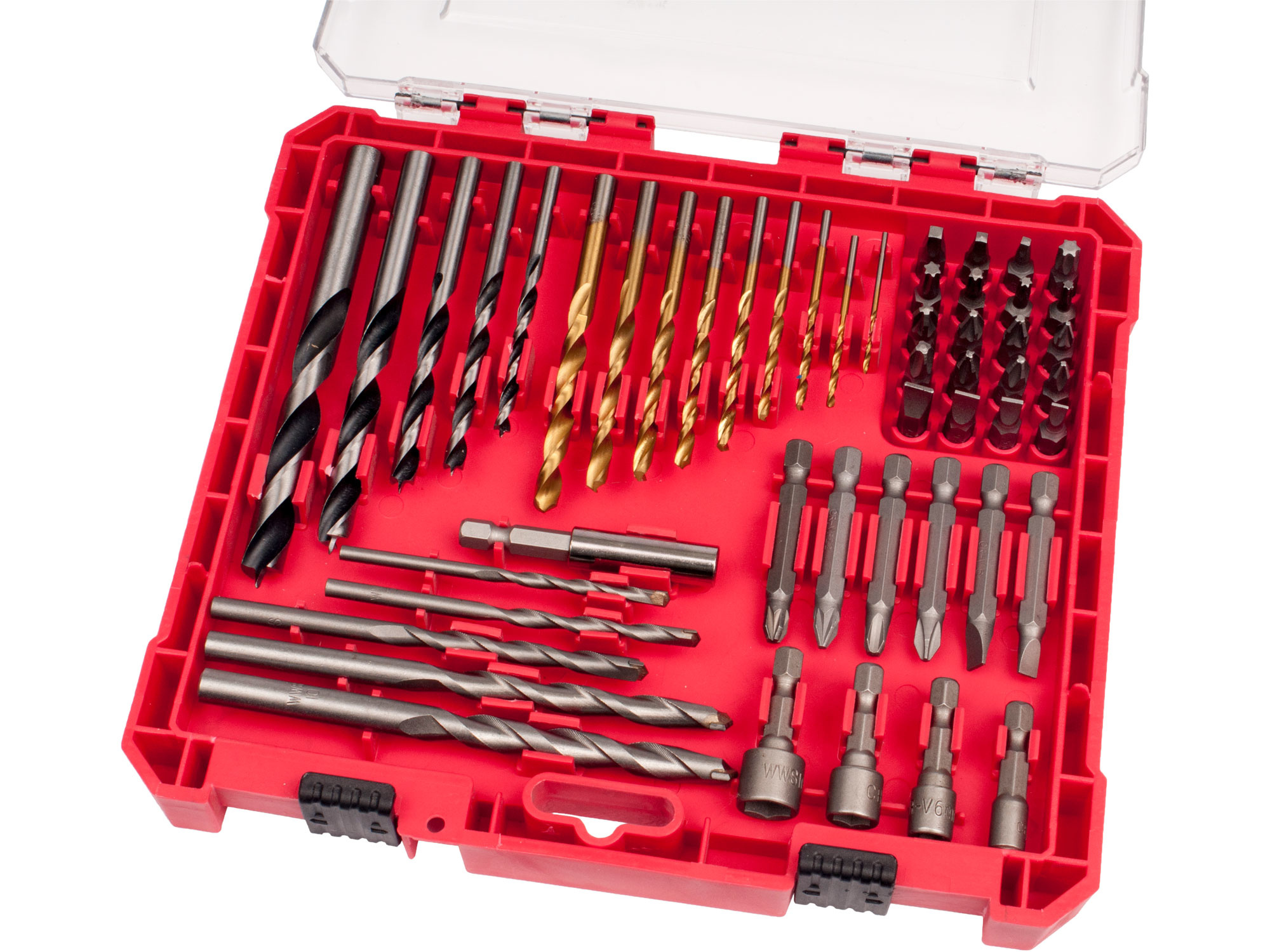 vrtáky do kovu(HSS-4241) : O 1,5-2-2,5-3-3,5-4-4,5-5-6mm; vrtáky do dřeva(HCS): O 4-5-6-8-10mm; vrtáky do zdiva(SK-YG8C): O 4-5-6-8-10mm; hroty 1/4"x25mm: (-) 4-5-6-7mm, PH1-2-2-3, PZ1-2-2-3, TORX T10-15-20-25-30, SQ 1-2-3; hroty 1/4"x50mm: (-) 5-6mm, PH2-3, PZ2-3; nástrčné hlavice (38mm): 5-6-8-10mm; magnet.nástavec na hroty 1/4"x59mm