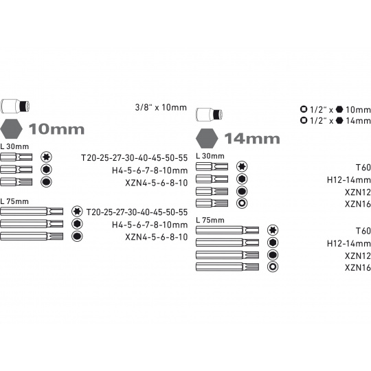 hroty zástrčné prodloužené 10mm(L75mm):T20-25-27-30-40-45-50-55, H4-5-6-7-8-10mm, XZN4-5-6-8-10; 14mm(L75mm): T60, H12-14mm, XZN12, XZNTa16
