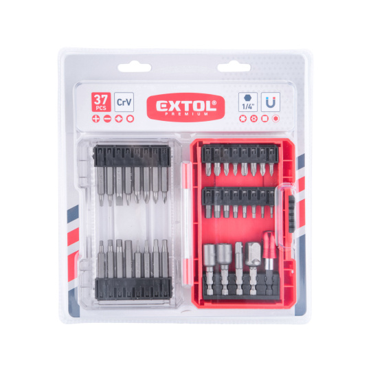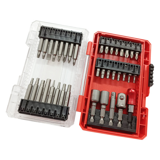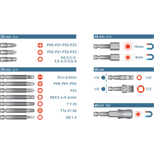 hroty 25mm: PH 0-1-2-3, PZ 0-1-2-3, HEX 2-2,5-3-3,5-4-5-5,5-6mm, hroty 50mm: (-) 4-6,5mm, PH 0-1-2, PZ2, HEX 3-4-5-6mm T 7-15, TTa 27-30, SQ 1-2, nástrčné hlavice 48mm: 8-10mm, adaptéry 50mm: 1/4"čtyřhran-1/4"hex, 1/2"čtyřhran-1/4"hex, magnetický držák 1/4" hrotů Fix-Clip 60mm,