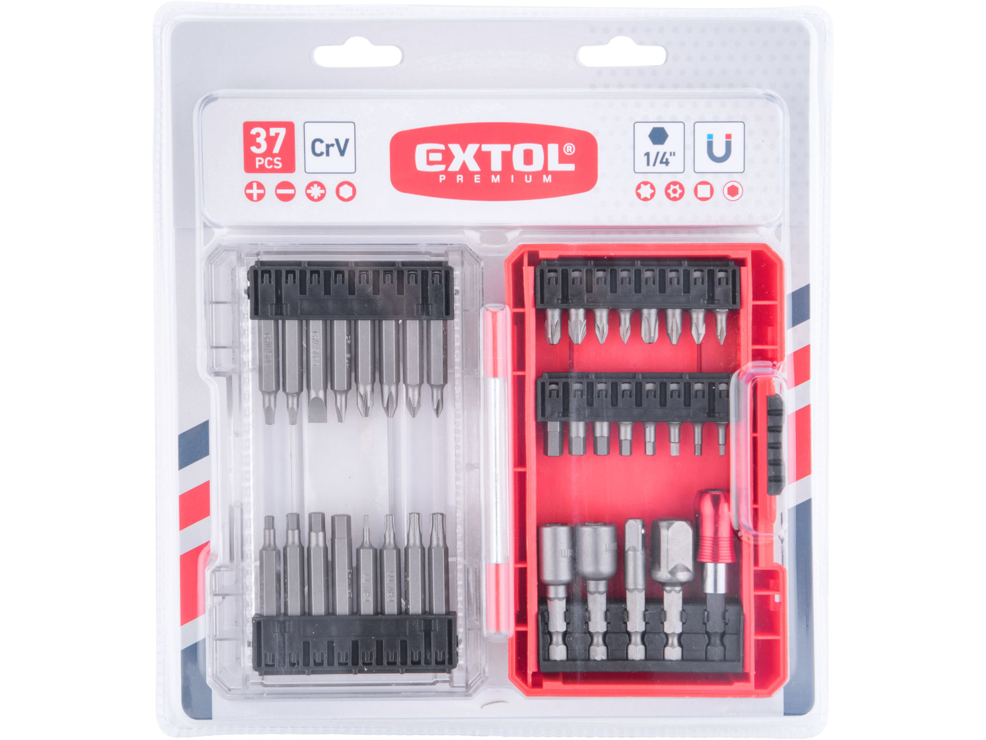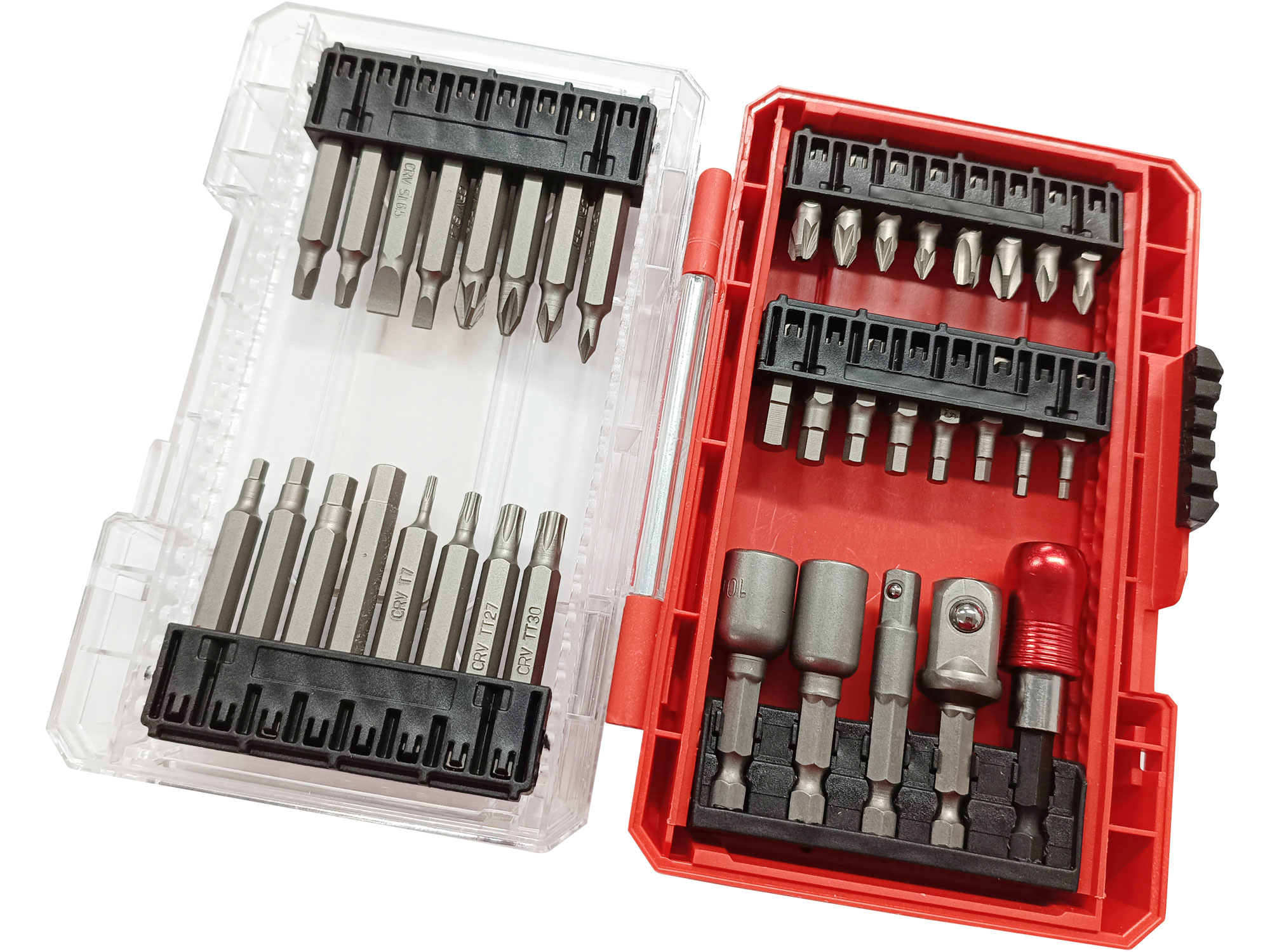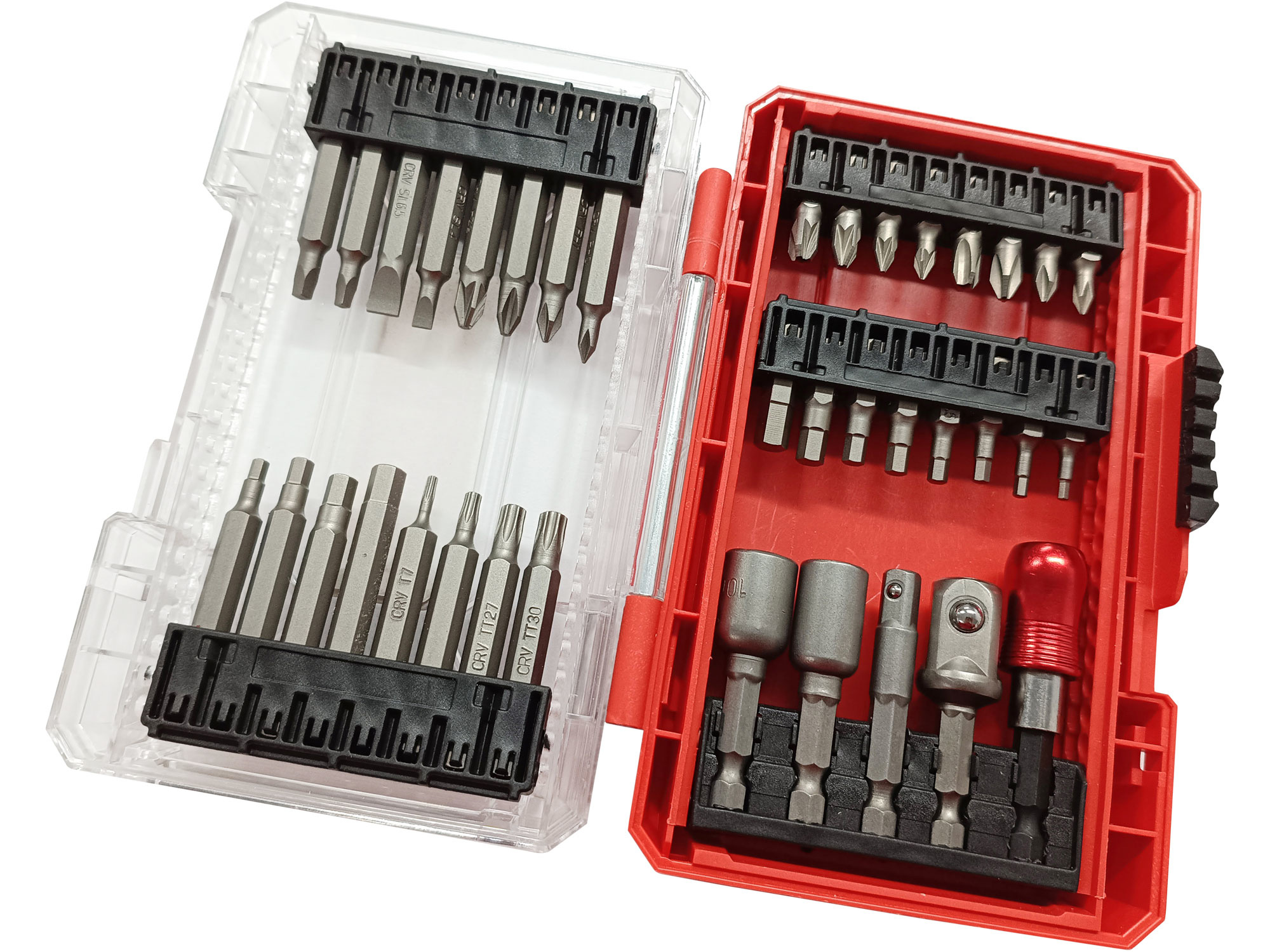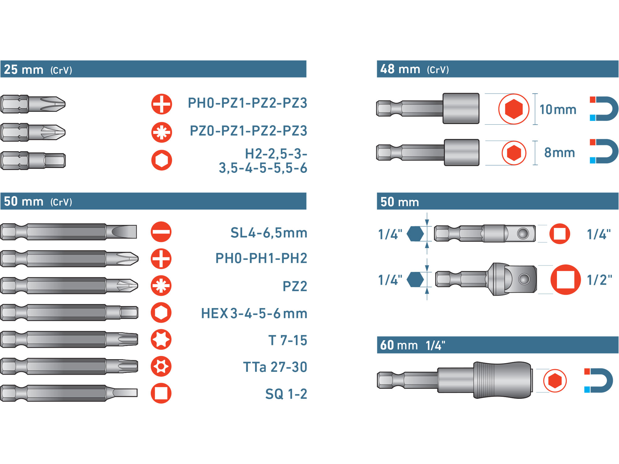 hroty 25mm: PH 0-1-2-3, PZ 0-1-2-3, HEX 2-2,5-3-3,5-4-5-5,5-6mm, hroty 50mm: (-) 4-6,5mm, PH 0-1-2, PZ2, HEX 3-4-5-6mm T 7-15, TTa 27-30, SQ 1-2, nástrčné hlavice 48mm: 8-10mm, adaptéry 50mm: 1/4"čtyřhran-1/4"hex, 1/2"čtyřhran-1/4"hex, magnetický držák 1/4" hrotů Fix-Clip 60mm,