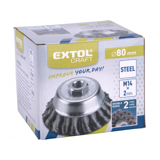 Řada technických kartáčů Extol nabízí široký výběr kartáčů pro všestranné nasazení, např. čištění povrchů materiálů, k odstraňování barev, nečistot, rzi, houževnatých nánosů, ke zdrsňování, odjehlování, odokujování apod. Upínání na úhlové brusky pomocí matice M14 a na vrtačky pomocí stopky o průměru 6mm.