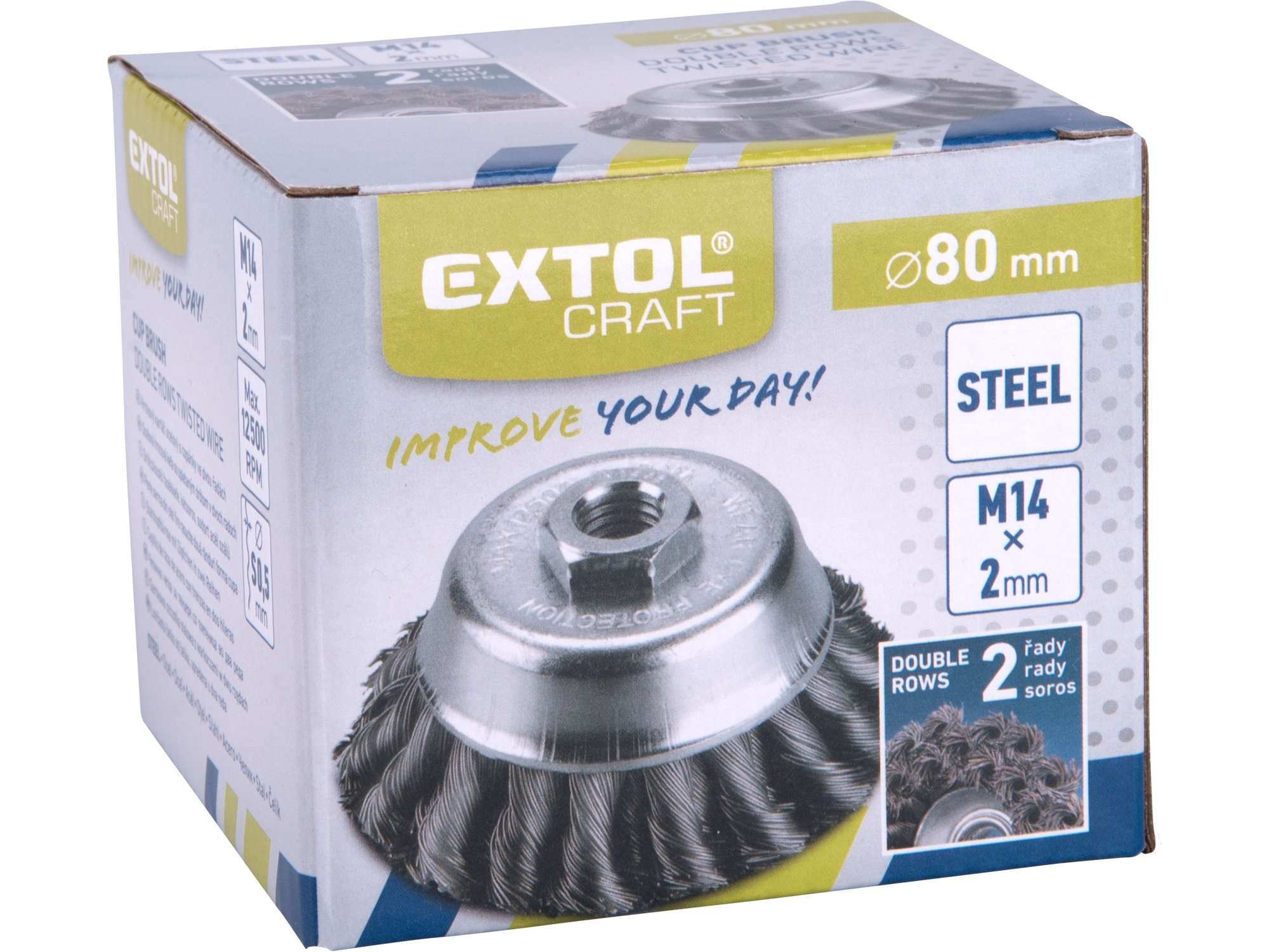 Řada technických kartáčů Extol nabízí široký výběr kartáčů pro všestranné nasazení, např. čištění povrchů materiálů, k odstraňování barev, nečistot, rzi, houževnatých nánosů, ke zdrsňování, odjehlování, odokujování apod. Upínání na úhlové brusky pomocí matice M14 a na vrtačky pomocí stopky o průměru 6mm.