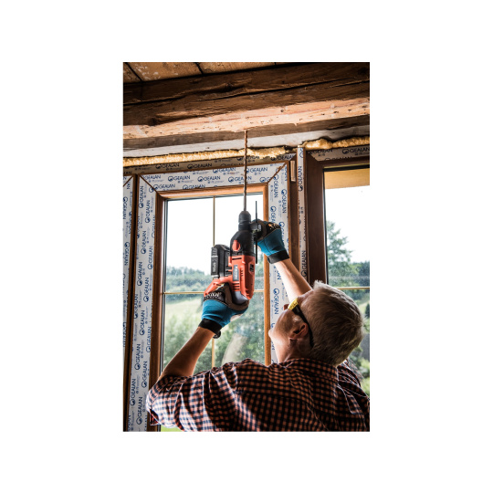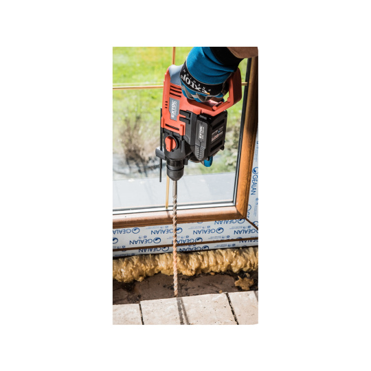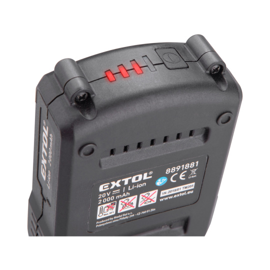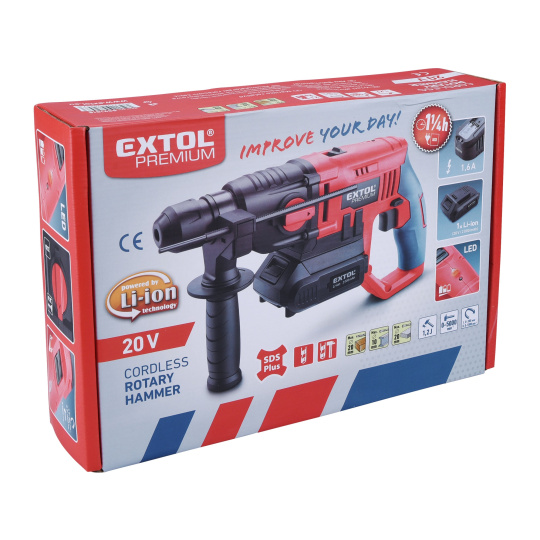 Aku vrtací kladivo je určeno k rychlému vrtání do cihel a betonu pomocí vrtáků s SDS Plus stopkou. Díky pneumatickému příklepovému systému je schopno vrtat mnohem rychleji a efektivněji než příklepové vrtačky. Jeho hlavní výhodou je akumulátorový pohon, který dovoluje si vzít kladivo s sebou tam kde s ním potřebujete pracovat, bez ohledu na to, jestli tam je rozvod elektrické energie. Kladivo je vybaveno zpětným chodem pro snadné vytažení zaseklého vrtáku a dvěma rozsahy rychlosti, které lze využít dle vrtaného materiálu. Pro běžnou práci dostačují jeden nebo dva 2000mAh akumulátory, které můžete rychle nabít v rychlonabíječce, pro náročnější nebo delší práci doporučujeme větší akumulátory s kapacitou 4000–8000mAh. Akumulátor lze použít ve všech typech nářadí řady EXTOL SHARE20V. Díky použité Li-ion technologii je ho možné kdykoliv dobíjet, aniž by se tím snižovala jeho kapacita. Li-ion akumulátor ztrácí energii vlivem samovybíjení velmi pomalu a vydrží dlouho nabitý a připravený k použití.