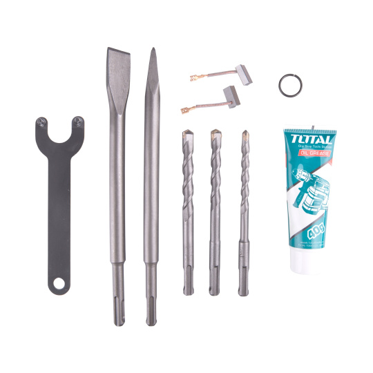 Vrtací a sekací kladivo určené pro náročnější vrtání do betonu a zdiva, lehké a středně těžké sekání do zdiva a betonu a osekávání obkladů či omítek. Toto kladivo se vyznačuje celokovovou masivní převodovkou. Polohovatelná rukojeť Vám umožní nastavit úchop tak, jak jej zrovna potřebujete. Síla úderu je 5,5J. Kladivo je vybaveno zámkem sekáče, které udržuje sekáč při sekání ve stejné poloze. Odpružená protiskluzová pogumovaná rukojeť snižuje vibrace při práci. Je vybaveno SDS Plus úchytem, 850 otáčkami/min a 4400 příklepy/min. Je dodáváno v kufru a součástí kladiva jsou i 3 kusy vrtáků a 3 kusy sekáčů. Doplňuje úspěšnou řadu vrtacích kladiv značky TOTAL Tools.