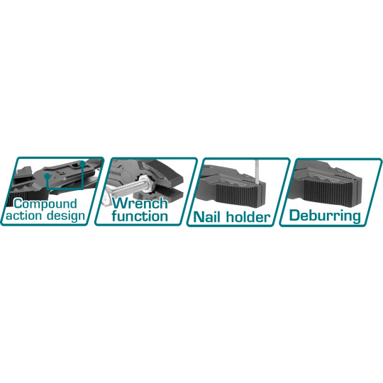 Velikost: 200 mm, Úspora energie 65% než běžné kleště, Materiál: Cr-V, Povrchová úprava: teflonový povlak, TPR tříbarevná rukojeť pro pevné uchopení a pohodlíS funkcí držáku na hřebíky, S funkcí klíče, S funkcí odhrotování, Baleno v polovičním dvojitém blistru.