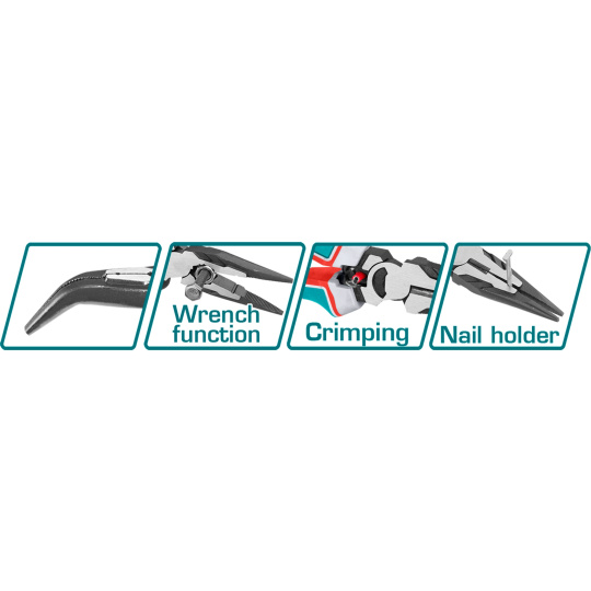 Velikost: 200 mm, Úspora energie 30 % oproti běžným kleštím, Materiál: Cr-VPovrchová úprava: černá a leštěná, TPR tříbarevná rukojeť pro pevné uchopení a pohodlí, S funkcí krimpování, S funkcí držáku hřebíků, S funkcí klíče.