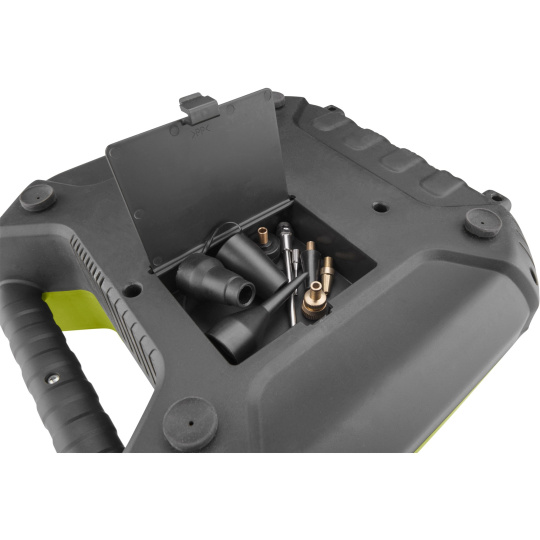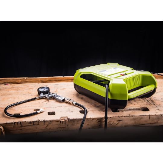 Bezolejový pístový kompresor je určen pro plnění pneumatik automobilů, motocyklů či kol a další drobné práce v domácnosti a domácím prostředí. Díky mnoha různým dodávaným koncovkám určených k připojení na hadici plniče lze rychle a bez námahy nafouknout objemná nafukovací lehátka, postele, čluny atd., přiloženou jehlou pak sportovní míče, cvičební balóny apod. Plnič pneumatik je vybaven integrovaným tlakoměrem a upouštěcím ventilem. Lze na něj také našroubovat ofukovací nástavec. Dále je vhodný pro drobné práce se stříkacím, čistícím, nýtovacím, hřebíkovacím a sponkovacím nářadím. Hadice je pokryta tkaninou, která omezuje kroucení a příjemně se s ní pracuje. Díky 5m napájecímu kabelu a 3m tlakové hadici nabízí kompresor pohodlný pracovní radius. Kabel, hadice a veškeré příslušenství lze uschovat v těle kompresoru. Gumové přísavky na spodní straně kompresoru tlumí vibrace přenášené do podlahy a stabilizují kompresor během provozu.