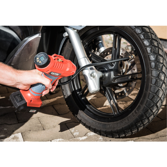 Výkonný a silný plnící aku kompresor, je určen ke kontrole a k doplnění tlaku pneumatik osobních a užitkových automobilů, motorek a cyklistických kol na předepsaný tlak a s dodávaným příslušenstvím také k nafouknutí sportovních míčů, lehátek, matrací apod. Na displeji kompresoru si můžete jednoduše zvolit tlak v bar, psi, kPa a kompresor se automaticky při dosažení této hodnoty zastaví. Pro práci ve tmě je tento displej podsvícený a kompresor má světlo, které svítí i když kompresor není zapnutý. Spínač kompresoru je vybaven pojistkou proti samovolnému spuštění a zámkem, kterým můžete zaaretovat spínač v poloze zapnuto. Samotný kompresor uvnitř stroje má celokovovou konstrukci zajišťující dlouhou životnost. Pro běžnou práci dostačují jeden nebo dva 2000mAh akumulátory, které můžete rychle nabít v rychlonabíječce, pro náročnější nebo delší práci doporučujeme větší akumulátory s kapacitou 4000–8000mAh. Akumulátor má indikátor nabití a lze použít ve všech typech nářadí řady EXTOL SHARE20V. Díky použité Li-ion technologii je ho možné kdykoliv dobíjet, aniž by se tím snižovala jeho kapacita. Li-ion akumulátor ztrácí energii vlivem samovybíjení velmi pomalu a vydrží dlouho nabitý a připravený k použití.