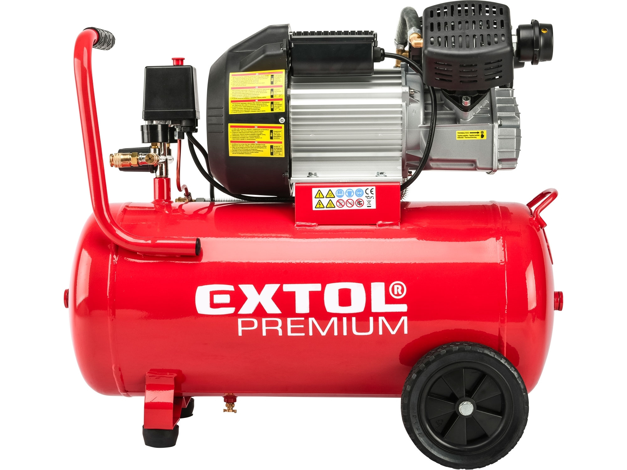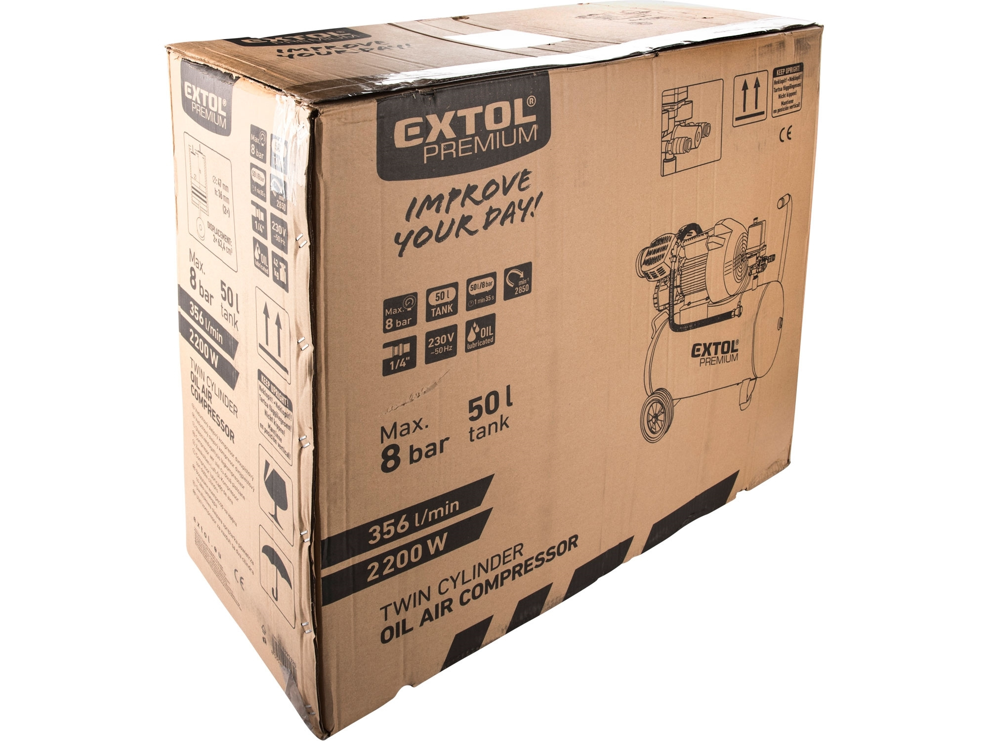 Dvoupístový olejový vzduchový kompresor s tlakovou nádobou o objemu 50l je určen k použití všude tam, kde je stlačeného vzduchu zapotřebí, tj. např. k nanášení barev stříkací pistolí, čištění tlakovým vzduchem ofukovací pistolí, pískování, olejování či mytí mlžící pistolí, plnění vzduchem plničem pneumatik, dále pro pohon pneumatického nářadí s ohledem na spotřebu vzduchu tímto nářadím a plnícím výkonem kompresoru apod.. Vyrovnaný vysoký výstupní tlak 8bar a sací výkon 356l/min umožňuje pohánět širokou škálu pneumatického nářadí. U tohoto kompresoru používáme silný motor s příkonem 2200W, kompresor se dvěma písty a větší nádrž 50l, která mu dává větší zásobu tlakového vzduchu, což mu umožňuje pracovat se silnějšími pneumatickými stroji, které potřebují velký průtok vzduchu. Jako příklad lze uvést stříkací pistole na barvu s velkými tryskami, silnější rázové utahováky nebo větší úhlové brusky. Kompresor je vybaven dvěma manometry. Na jednom manometru se zobrazuje hodnota tlaku v nádrži a na druhém je výstupní tlak. Pomocí regulačního ventilu lze tento výstupní tlak přesně nastavit. Abychom zvýšili životnost stroje, používáme na vstupu vzduchu odolné kovové filtry. Konstrukční řešení umožňující mazání olejem zaručuje vyšší výkonnost a delší životnost stroje. Na nádrži je ventil pro vypuštění kondenzátu. Snadnou manipulaci s kompresorem zajišťují kolečka a pevná rukojeť.