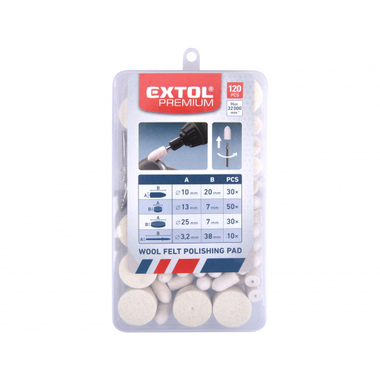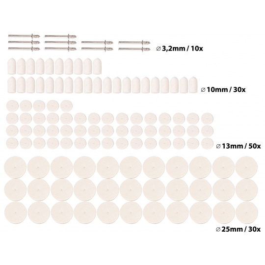 plstěné kotouče: ⌀10 x 20mm - 30x, ⌀13 x 7mm - 50x, ⌀25 x 7mm - 30x, unašeč 10x, stopka ⌀3,2mm, plastová krabička
