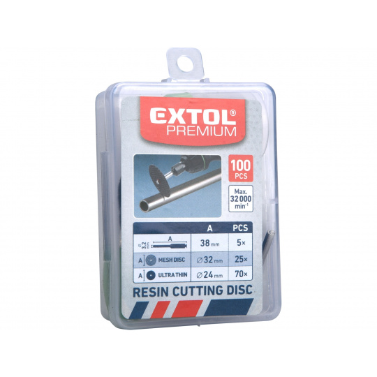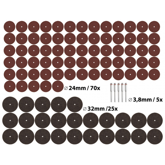 kotouče: ⌀24mm - 70x, ⌀32mm - 25x, unašeč 5x, stopka ⌀3,2mm, plastová krabička