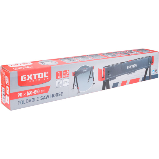 Tato stavební koza EXTOL PREMIUM je vhodná všude tam, kde potřebujete vytvořit výškově nastavitelnou pracovní plochu nebo stůl. V páru dvě kozy disponují více než dostatečnou nosností až 1100kg (550kg/kus). Na obou koncích má koza odnímatelný boční úchyt s fixní šířkou 45mm k případnému uchycení trámkových dřevěných profilů a následnému rozšíření pracovní plochy mezi dvě kozy.