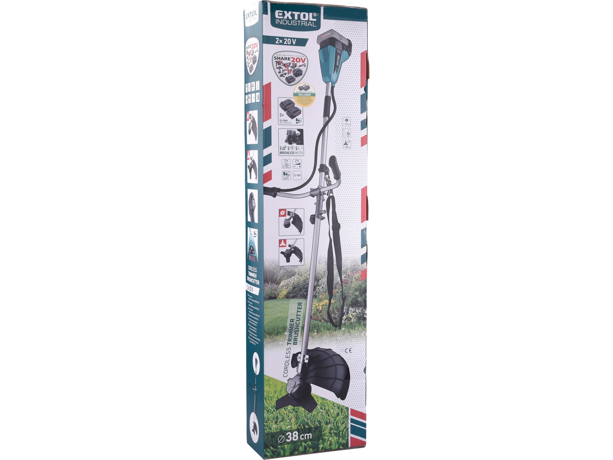 Silný aku křovinořez určený k sekání vysoké trávy nebo suché trávy, vysokých kopřiv a keřů a podrostu s průměrem kmene až 4cm s pomocí ocelového žacího nože nebo k sekání nižší trávy pomocí žací struny. Pro snadnou manipulaci při sekání má křovinořez ergonomicky tvarované rukojeti ve tvaru cyklořídítek a ramenní popruh, který přenáší většinu hmotnosti na tělo a ruce používáte jen pro jemnou manipulaci při sekání. Křovinořez je poháněn nejmodernějším „brushless” motorem. Tento nový typ motoru má vyšší životnost, je výkonnější a má menší spotřebu el. energie než klasické motory s uhlíkovými kartáči. Díky malé velikosti a při zachování vysokého výkonu je možné motor umístit do hlavy sekačky a díky tomu je v dlouhé tyči sekačky jen kabel, což umožňuje výrazně snížit vibrace a zvýšit efektivitu motoru. Do stroje se vkládají dvě baterie SHARE20V, které společně umožňují motoru mít vysoký výkon i při zatížení. Při použití žací struny ji lze při práci prodloužit poklepem na zem. Na rukojeti je snadno přístupné tlačítko pro zapnutí a regulaci otáček ve 3 stupních: 3800/5000/6700 otáček/min. Dále jsou tam umístněné bezpečnostní tlačítka zabraňující náhodnému spuštění stroje při manipulaci. Pro snadnou přepravu lze křovinořez jednoduše “rozpůlit” bez nástroje pomocí jednoho šroubu. Pro běžnou práci dostačují dva 2Ah akumulátory, oba dva můžete najednou rychle nabít v rychlonabíječce za 35min, pro náročnější nebo delší práci doporučujeme větší akumulátory s kapacitou 4–8Ah. Akumulátory lze použít ve všech typech nářadí řady EXTOL SHARE20V. Díky použité Li-ion technologii je ho možné kdykoliv dobíjet, aniž by se tím snižovala jeho kapacita. Li-ion akumulátor ztrácí energii vlivem samovybíjení velmi pomalu a vydrží dlouho nabitý a připravený k použití.