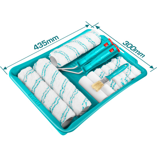 Malířský set pro vnitřní malbu obahuje: 3 ks 230mm 12mm válečků, 5 ks 100mm 12mm válečků, 2 ks 100mm polyesterového válečku, 1ks držáku na válečky 230mm, 1ks držáku na válečky 100mm, 1ks štětce 25mm a 1ks vaničky 435x300mm.