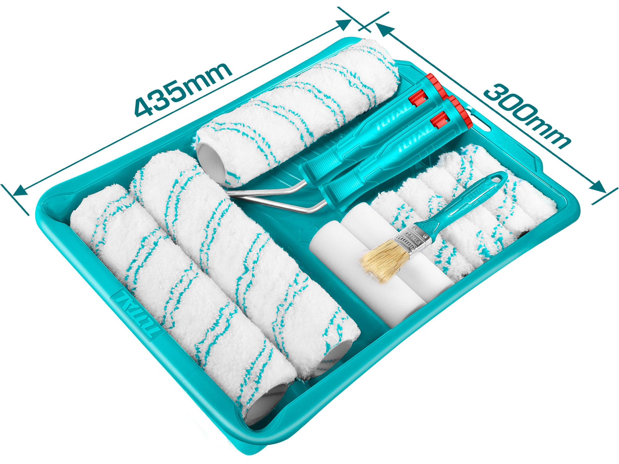 Malířský set pro vnitřní malbu obahuje: 3 ks 230mm 12mm válečků, 5 ks 100mm 12mm válečků, 2 ks 100mm polyesterového válečku, 1ks držáku na válečky 230mm, 1ks držáku na válečky 100mm, 1ks štětce 25mm a 1ks vaničky 435x300mm.