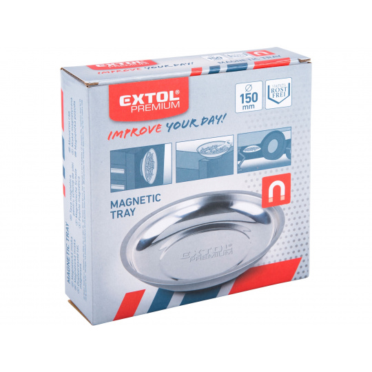 miska z nerezové oceli se silným magnetem na dně slouží k odkládání malých kovových předmětů, matek, šroubů a podložek, lze ji umístit v horizontální a vertikální poloze i dnem vzhůru na kovové povrchy, karoserie aut apod.