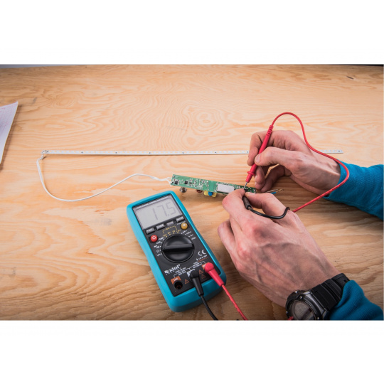 rozsah měření: DC napětí 200mV-600V, AC napětí 2V-600V, DC a AC proud 200µA-10A, odpor 200Ω-20MΩ, teplota -20°C-1000°C, test baterií 1,5/3/9/12V, test tranzistorů a diod, měření spojitosti obvodů