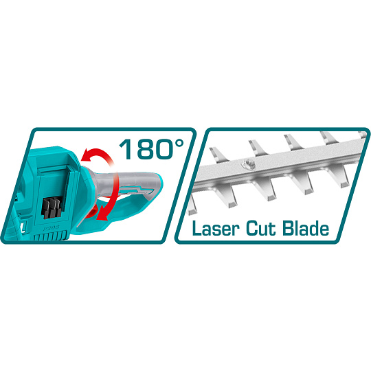 Tyto akumulátorové nůžky jsou určeny ke stříhání živého plotu, keřů, křovin a nově vzrostlých větví v domácích zahradách. Jedná se o novinku společnosti Total. Nůžky jsou napájeny dvěma bateriemi 2000mAh, čímž docílí vyššího výkonu a delší pracovní doby nůžek. Nůžky v sobě mají integrovány 3 pojistky proti spuštění, jsou vybaveny nejmodernějším bezuhlíkovým motorem a pogumovanou rukojetí, která se osvědčila jako protiskluzová. Tyto nůžky jsou součástí populární řady P20S, tedy řady 180 výrobků na jednu baterii. Pokud tedy již vlastníte nějaký bateriový výrobek z řady Total 20V, nemusíte dokupovat k tomuto výrobku baterii a nabíječku. Můžete ji použít z již zakoupeného výrobku. Nepřítomnost napájecího kabelu poskytuje svobodu a komfort při práci a manipulaci s nářadím. Nářadí lze tak s výhodou použít pro práci v místech, kde není možné použít elektrické nářadí s napájecím kabelem z důvodu nedostupnosti distribuční elektrické sítě.