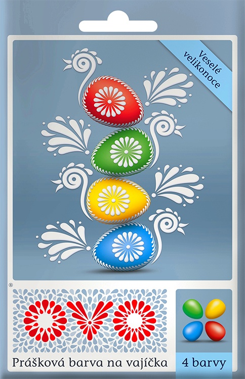 Čtyři práškové barvy ( žlutá, červená, modrá a zelená ) určené na barvení velikonočních vajec. Snadná a rychlá aplikace, výrazné barvy.