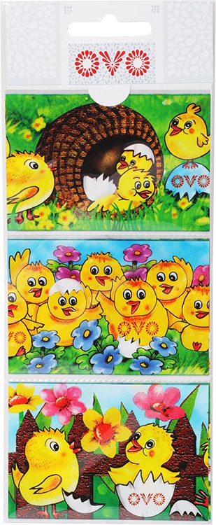 Smršťovací košilky s motivy kuřátek. Odstřihneme obrázek z pásu a navlékneme košilku na uvařené vajíčko, poté ponoříme na lžíci do horké vody na 3 sekundy.