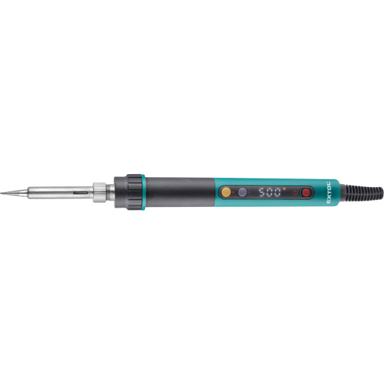 Profesionální mikroprocesorová hrotová pájka s displejem je určena k měkkému pájení, které vyžaduje přesnost a kontrolu teploty hrotu, zejména v elektronice a v bižuterii. S použitím vhodného pájecího hrotu lze pájku použít také k drobnému řezání či spojování plastů a také k vypalování symbolů do dřeva. V pájce se používají standardní hroty typu 900M. Hrot pájky je nahříván keramickým tělesem s vnitřním topícím prvkem. Teplotní čidlo ve spojení s mikroprocesorem zajišťuje zpětnovazební kontrolu a pájka reaguje velmi rychle na změnu teploty hrotu. Použitý LCD displej má perfektní viditelnost pod všemi úhly a při jakýchkoliv světelných podmínkách. Zobrazuje se na něm jak cílová teplota, tak okamžitá teplota hrotu a indikátor nahřívání. Jednotky teploty si můžete zvolit mezi ˚C a ˚F. Pomocí tlačítek nastavíte teplotu v rozsahu 80–500°C. Pájka je vybavena několika funkcemi: nastavení startovací teploty, kalibrací a zámkem. Pomocí funkce nastavení startovací teploty si nastavíte teplotu která se objeví po zapnutí pájky. Kalibrací teploty můžete kompenzovat teplotní ztráty, které vzniknou při použití větších hrotů v rozsahu ±50˚C. Zámkem nastavíte heslo, které je nutno zadat, aby jste mohli měnit nastavení pájky. Pájka má také ESD ochranu proti výboji statické elektřiny. Plastový přechod mezi kovovou a plastovou částí je vyroben ze speciálního vysoce tepelně odolného plastu a ručka je potažená silikonem pro příjemné držení při práci. Součástí balení je menší stojánek s houbičkou pro odložení pájky.