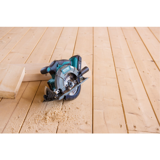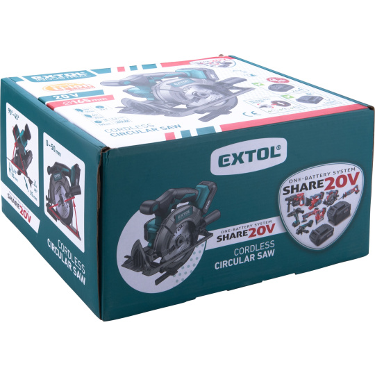 Brushless kotoučová pila je navržena tak, aby uživatelům poskytla výkonné a snadné řezání při různých instalatérských, elektrických, rámovacích, dokončovacích a tesařských pracích. Pila je poháněná nejmodernějším „brushless" motorem s 3650 ot./min umožňuje uživatelům rychle a snadno řezat tvrdým materiálem. Tento nový typ motoru má vyšší životnost, je výkonnější a má menší spotřebu el. energie než klasické motory s uhlíkovými kartáči. Horní a spodní kovový ochranný kryt poskytují vynikající ochranu kotouče při pádu. Gumová měkká rukojeť je ergonomicky navržena tak, aby uživatelům poskytovala vynikající pohodlí a vyvážení pro snadno ovladatelné řezy. Pro běžnou práci dostačují jeden nebo dva 2000mAh akumulátory, které můžete rychle nabít v rychlonabíječce, pro náročnější nebo delší práci doporučujeme větší akumulátory s kapacitou 4000–8000mAh. Akumulátor lze použít ve všech typech nářadí řady EXTOL SHARE20V. Díky použité Li-ion technologii je ho možné kdykoliv dobíjet, aniž by se tím snižovala jeho kapacita. Li-ion akumulátor ztrácí energii vlivem samovybíjení velmi pomalu a vydrží dlouho nabitý a připravený k použití.
