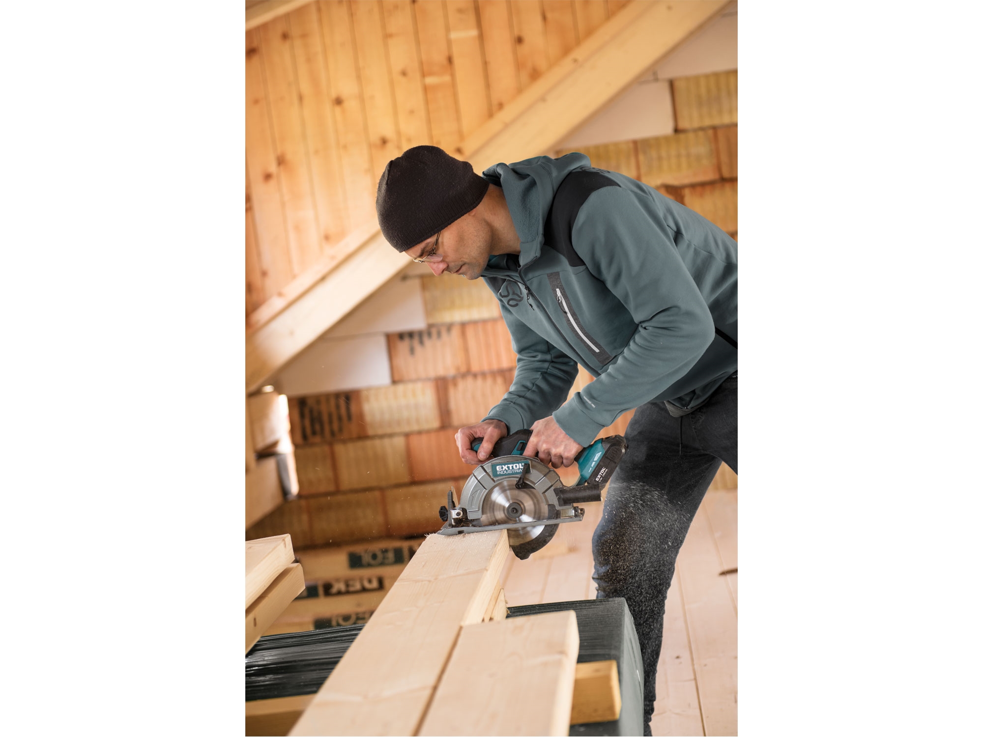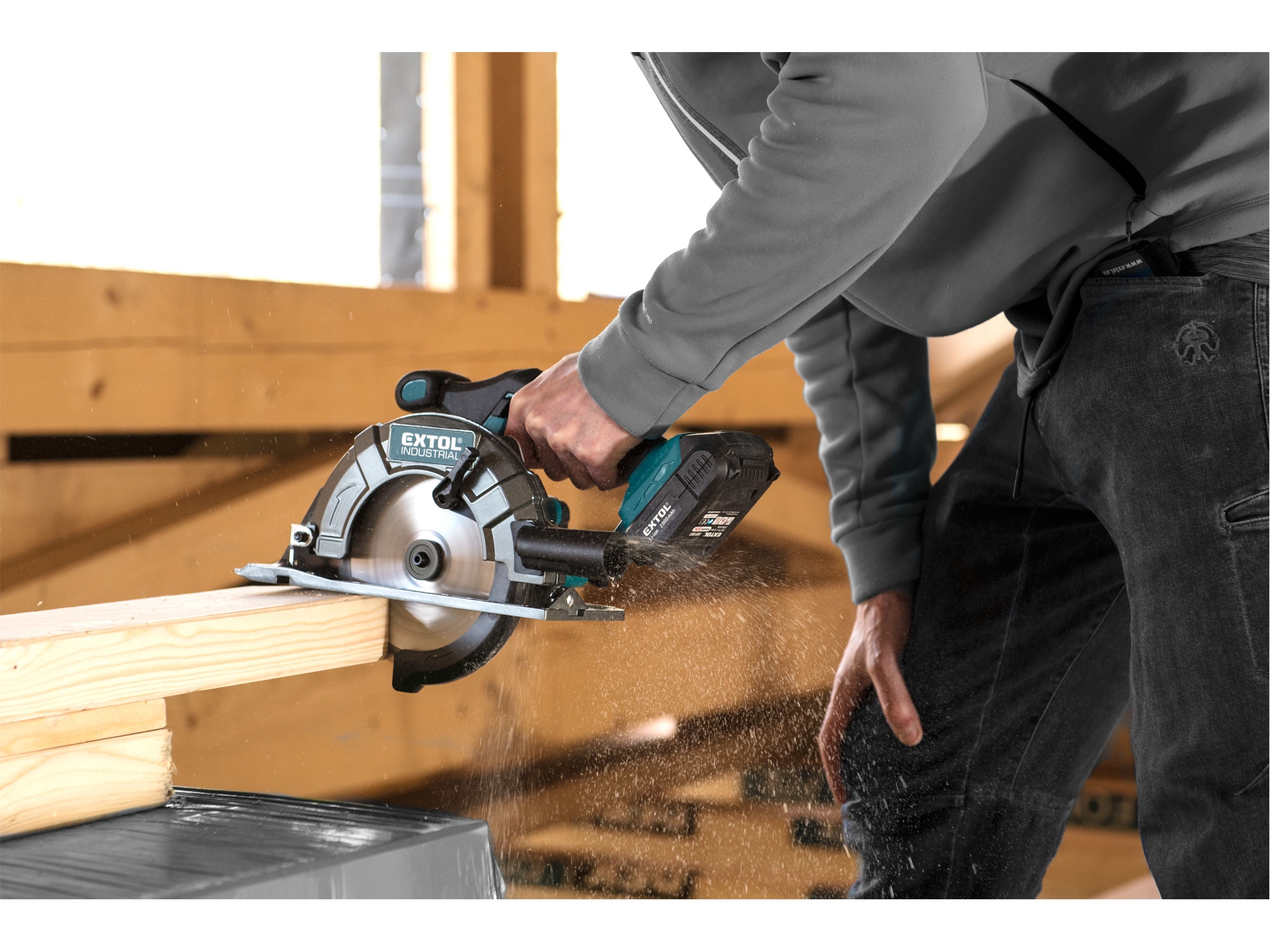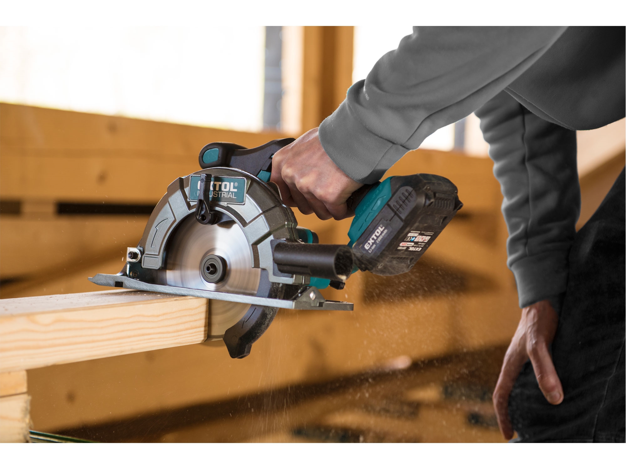Brushless kotoučová pila je navržena tak, aby uživatelům poskytla výkonné a snadné řezání při různých instalatérských, elektrických, rámovacích, dokončovacích a tesařských pracích. Pila je poháněná nejmodernějším „brushless" motorem s 3650 ot./min umožňuje uživatelům rychle a snadno řezat tvrdým materiálem. Tento nový typ motoru má vyšší životnost, je výkonnější a má menší spotřebu el. energie než klasické motory s uhlíkovými kartáči. Horní a spodní kovový ochranný kryt poskytují vynikající ochranu kotouče při pádu. Gumová měkká rukojeť je ergonomicky navržena tak, aby uživatelům poskytovala vynikající pohodlí a vyvážení pro snadno ovladatelné řezy. Pro běžnou práci dostačují jeden nebo dva 2000mAh akumulátory, které můžete rychle nabít v rychlonabíječce, pro náročnější nebo delší práci doporučujeme větší akumulátory s kapacitou 4000–8000mAh. Akumulátor lze použít ve všech typech nářadí řady EXTOL SHARE20V. Díky použité Li-ion technologii je ho možné kdykoliv dobíjet, aniž by se tím snižovala jeho kapacita. Li-ion akumulátor ztrácí energii vlivem samovybíjení velmi pomalu a vydrží dlouho nabitý a připravený k použití.