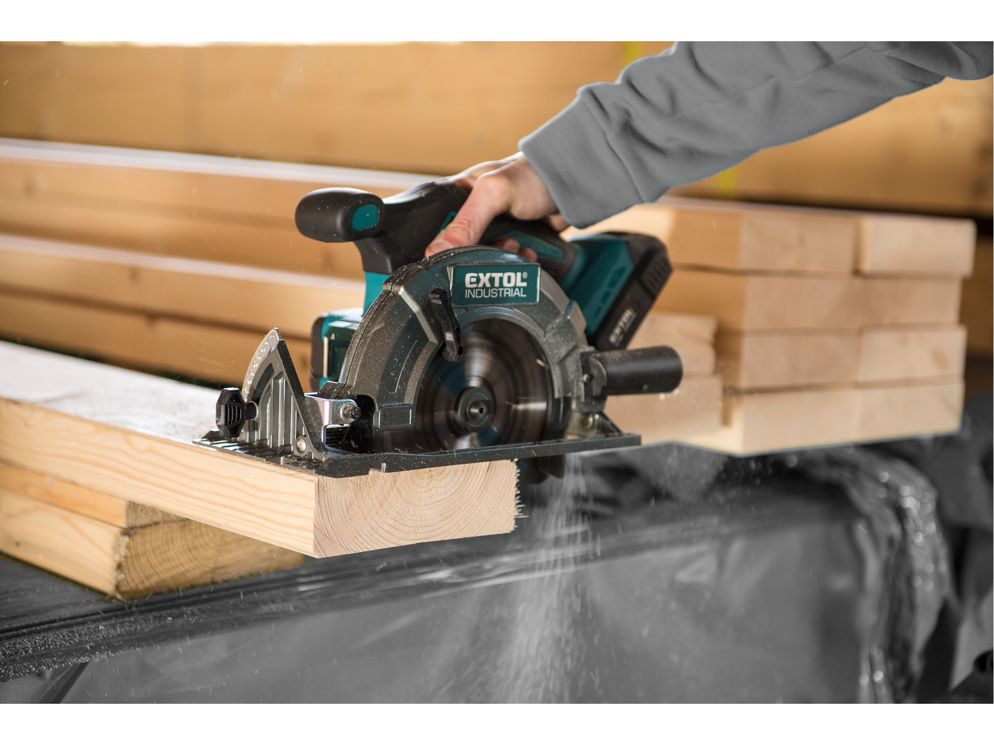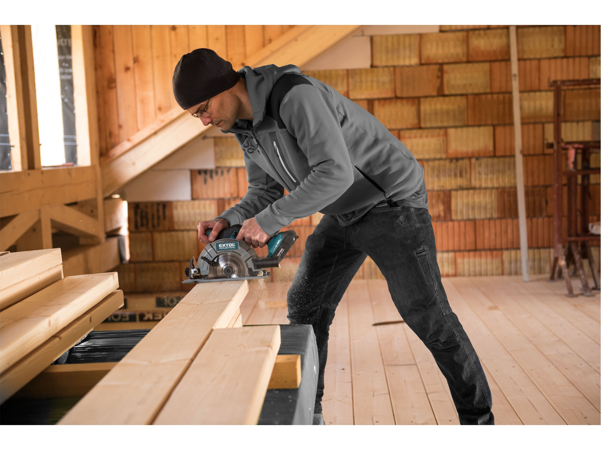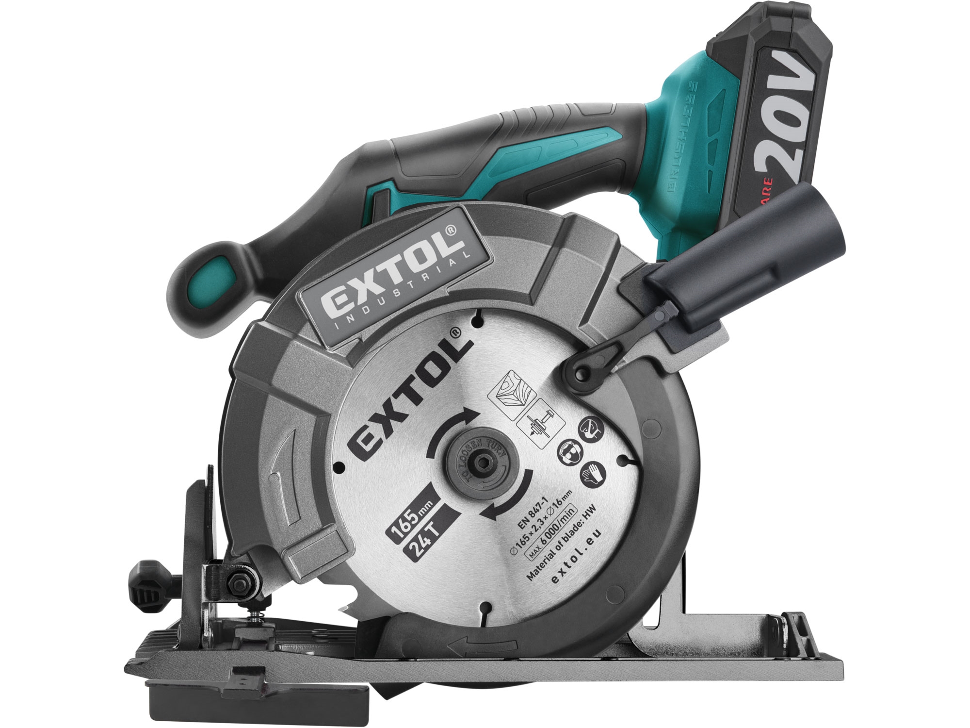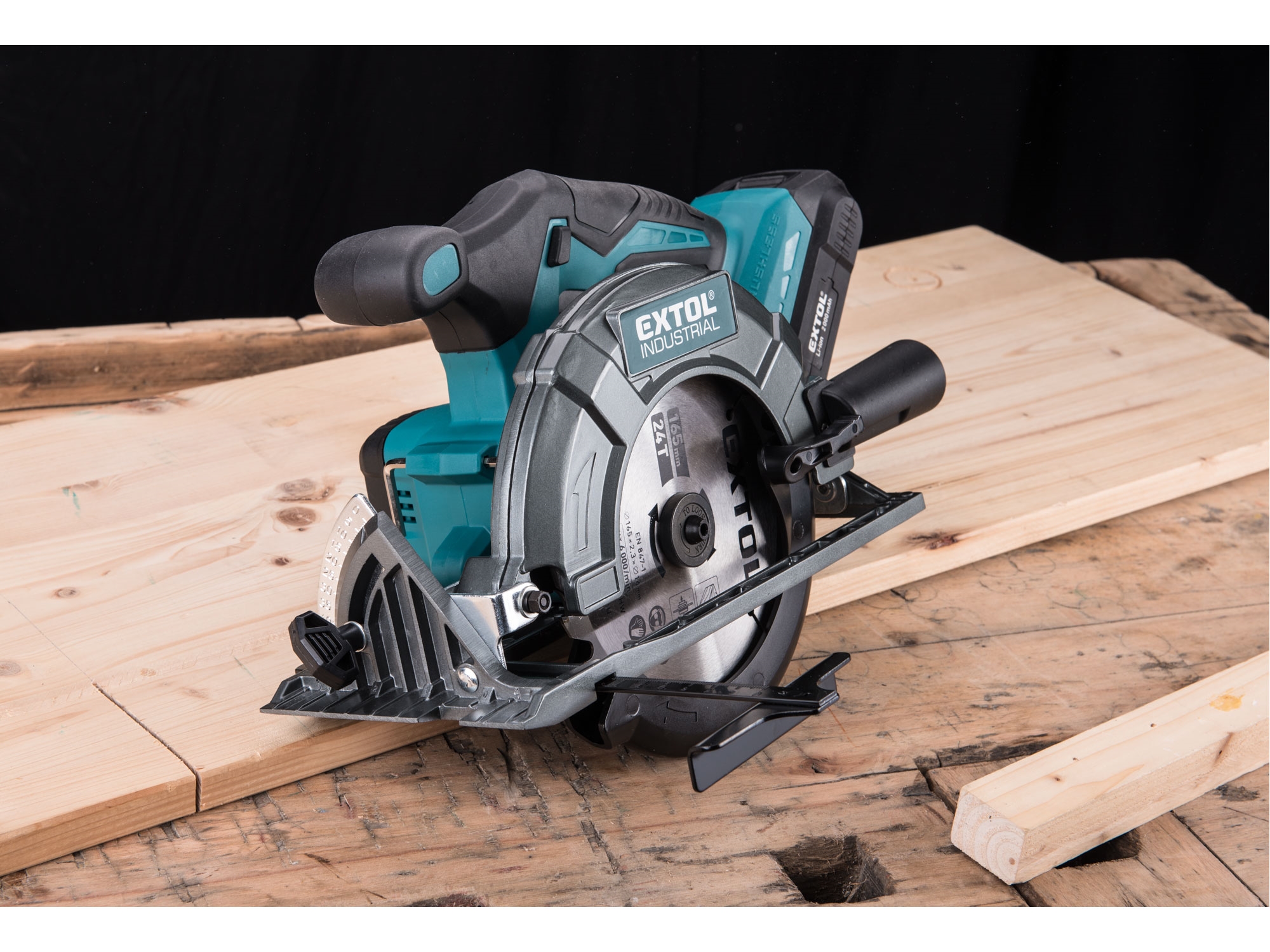 Brushless kotoučová pila je navržena tak, aby uživatelům poskytla výkonné a snadné řezání při různých instalatérských, elektrických, rámovacích, dokončovacích a tesařských pracích. Pila je poháněná nejmodernějším „brushless" motorem s 3650 ot./min umožňuje uživatelům rychle a snadno řezat tvrdým materiálem. Tento nový typ motoru má vyšší životnost, je výkonnější a má menší spotřebu el. energie než klasické motory s uhlíkovými kartáči. Horní a spodní kovový ochranný kryt poskytují vynikající ochranu kotouče při pádu. Gumová měkká rukojeť je ergonomicky navržena tak, aby uživatelům poskytovala vynikající pohodlí a vyvážení pro snadno ovladatelné řezy. Pro běžnou práci dostačují jeden nebo dva 2000mAh akumulátory, které můžete rychle nabít v rychlonabíječce, pro náročnější nebo delší práci doporučujeme větší akumulátory s kapacitou 4000–8000mAh. Akumulátor lze použít ve všech typech nářadí řady EXTOL SHARE20V. Díky použité Li-ion technologii je ho možné kdykoliv dobíjet, aniž by se tím snižovala jeho kapacita. Li-ion akumulátor ztrácí energii vlivem samovybíjení velmi pomalu a vydrží dlouho nabitý a připravený k použití.