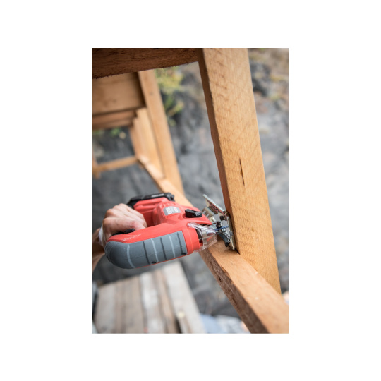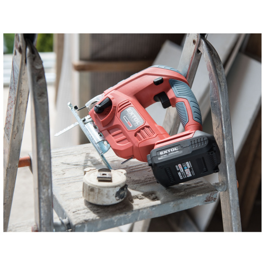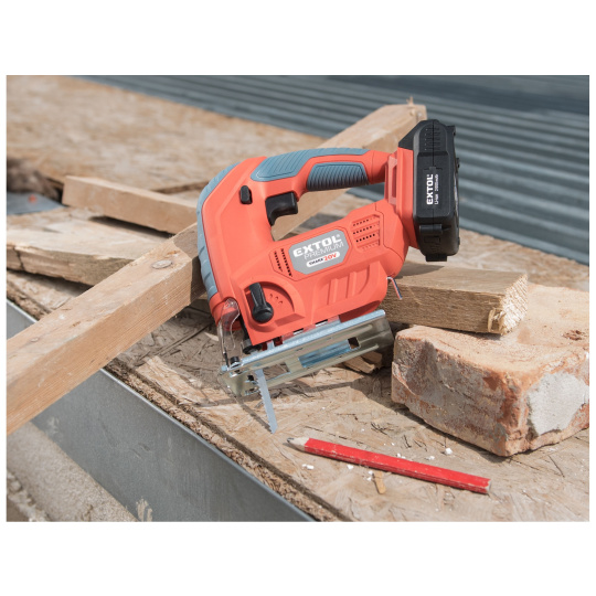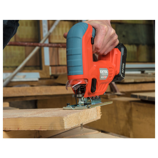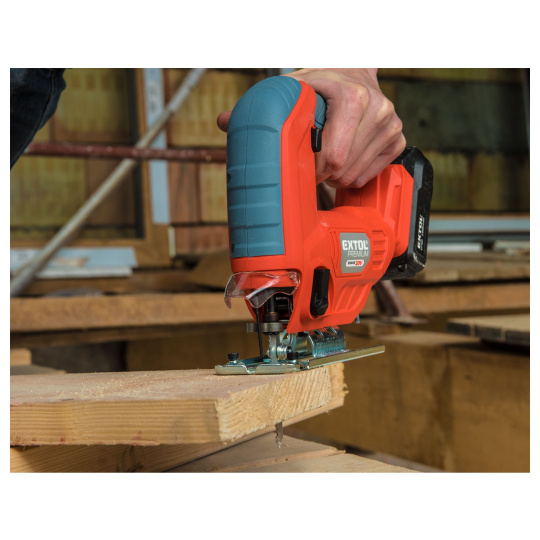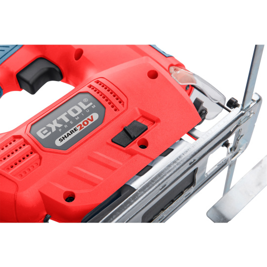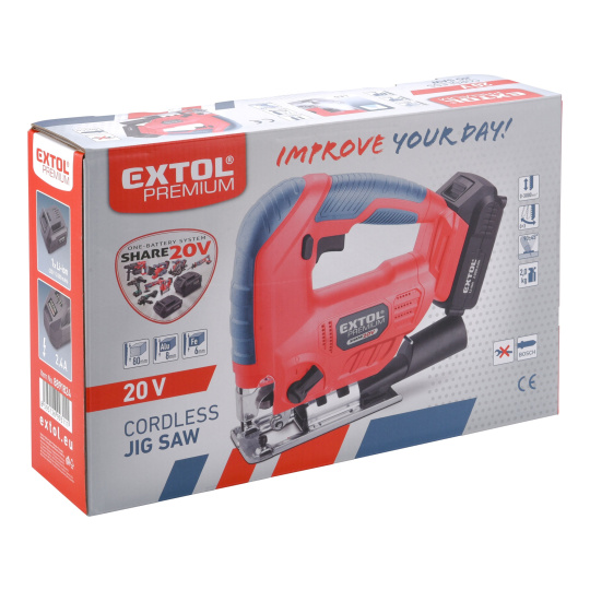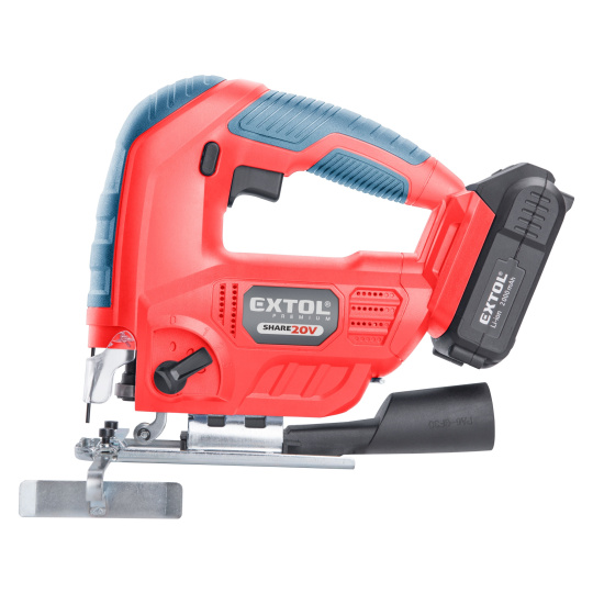 Aku přímočará pila SHARE20V je určena k provádění dělících a tvarových řezů, zejména do dřeva a dřevotřísky a k řezání kovů, plastu, keramických desek a gumy, dále sádrokartonu, cementotřískového materiálu. Díky rychloupínacímu systému lze pilový plátek „Bosch“ vyměnit bez použití nástrojů. Lze použít plátek jakéhokoliv výrobce s tímto úchytem. Standartně při řezání pila odfukuje piliny z místa řezání, ale pokud k ní připojíte vysavač, můžete tento odfuk přepnout a piliny přímo odsávat do vysavače, čímž dosáhnete mnohem čistějšího pracovního místa. Při řezání sádrokartónu a podobných materiálů s velmi jemným prachem je nutno vždy používat odsávání vysavačem. Při práci můžete regulovat rychlost kmitů pomocí spínače a také můžete nastavit sílu předkmitu. Obě nastavení se používají pro změnu stylu a rychlosti řezání v odlišných materiálech. Pro snadnější práci má pila LED světlo osvětlující pracovní místo, které se automaticky zapíná při stisku spínače. Gumová vrstva pokrývající pilu v místě úchopu snižuje množství vibrací, které se přenášejí do rukou a snižuje únavu při práci. Pro běžnou práci dostačují jeden nebo dva 2000mAh akumulátory, které můžete rychle nabít v rychlonabíječce, pro náročnější nebo delší práci doporučujeme větší akumulátory s kapacitou 4000–8000mAh. Akumulátor lze použít ve všech typech nářadí řady EXTOL SHARE20V. Díky použité Li-ion technologii je ho možné kdykoliv dobíjet, aniž by se tím snižovala jeho kapacita. Li-ion akumulátor ztrácí energii vlivem samovybíjení velmi pomalu a vydrží dlouho nabitý a připravený k použití.