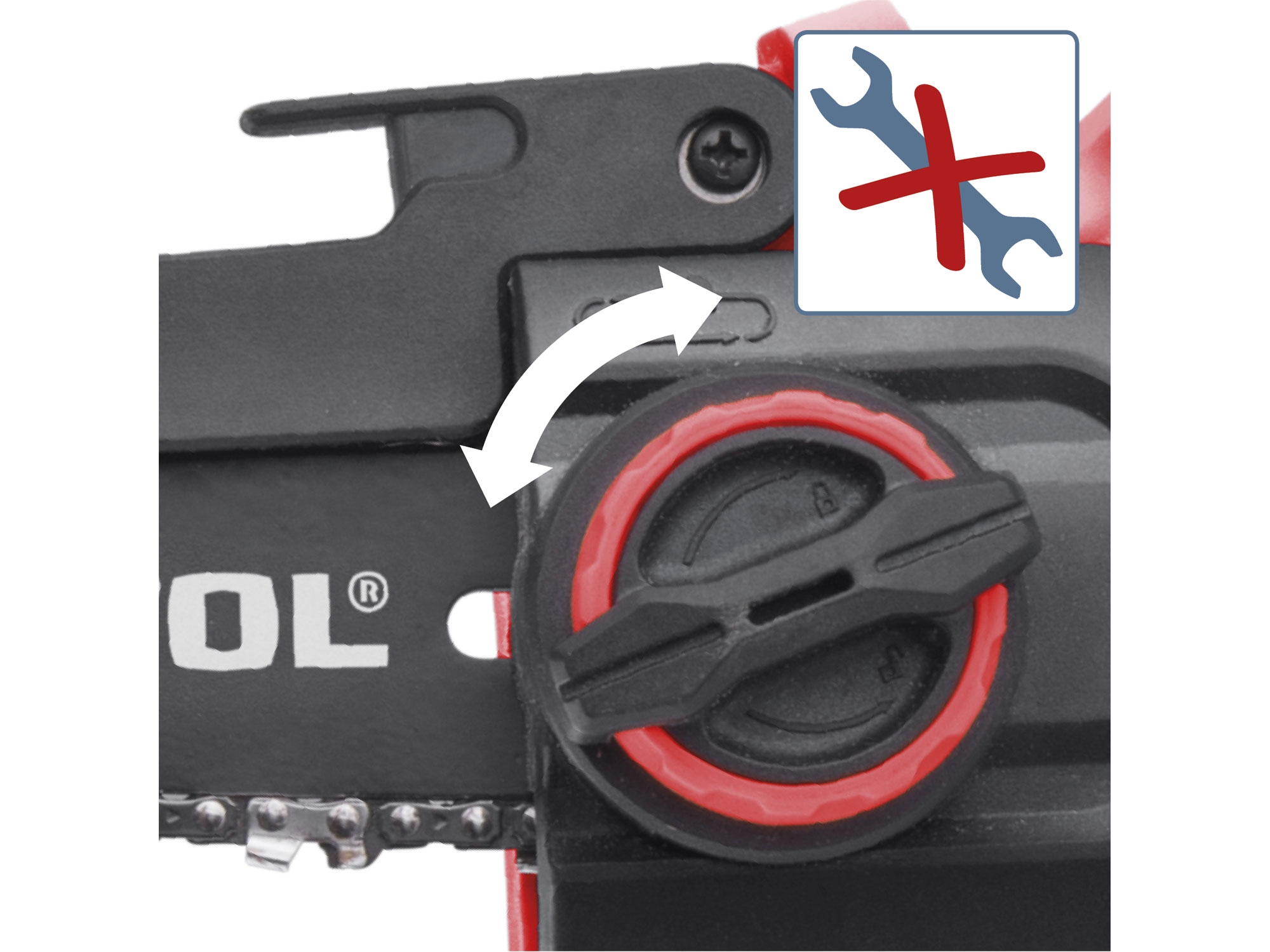 Jednoruční řetězová aku pila je určena k prořezávání stromů a keřů a pro drobné zkracovací řezy dřeva na zahradě, v dílně apod. Aku řetězová pila spojuje výhody elektrických pil – nízký hluk, jednoduchost obsluhy a údržby se svobodou pohybu u benzínových pil. Tato malá aku pila váží jen 1,8kg a je dostatečně robustní na to, aby si snadno poradila s větvemi, ale zároveň dostatečně lehká na to, aby se dala ovládat jednou rukou. Je vybavena kvalitní vodící lištou a pilovým řetězem. Pila má také systém pro snadnou a rychlou výměnu řetězu a mechanismem pro jednoduché vypnutí řetězu. Vysokou bezpečnost zajišťují tři prvky: horní chránič řetězu, chránič rukou, který vás chrání před pořezáním, poškrábáním a škrábanci a spínačem s pojistkou zabraňující náhodnému spuštění. Pogumovaná rukojeť brání vysmeknutí, tlumí vibrace a zpříjemňuje držení při práci. Akumulátor je vybaven ukazatelem nabití, což umožňuje uživateli si rozvrhnout délku práce a dát si včas nabít další akumulátor. Pro běžnou práci dostačují jeden nebo dva 2Ah akumulátory, které můžete rychle nabít v rychlonabíječce, pro náročnější nebo delší práci doporučujeme větší akumulátory s kapacitou 4–8Ah. Akumulátor lze použít ve všech typech nářadí řady EXTOL SHARE20V. Díky použité Li-ion technologii je ho možné kdykoliv dobíjet, aniž by se tím snižovala jeho kapacita. Li-ion akumulátor ztrácí energii vlivem samovybíjení velmi pomalu a vydrží dlouho nabitý a připravený k použití.
