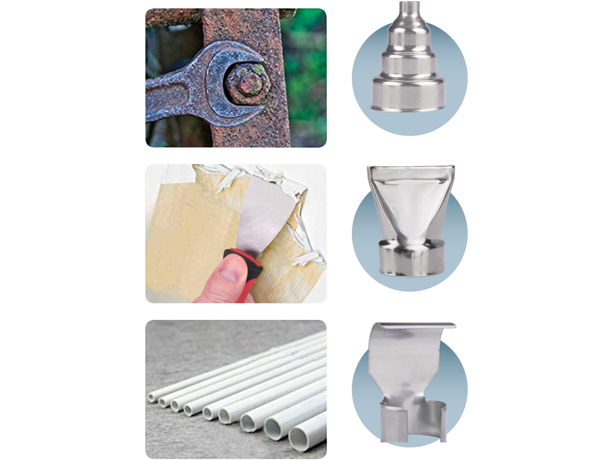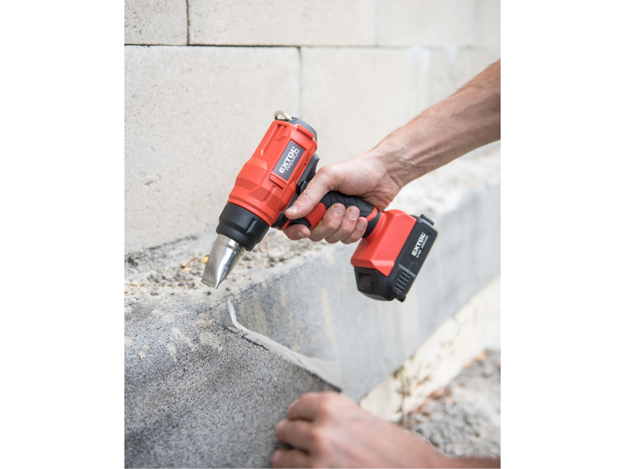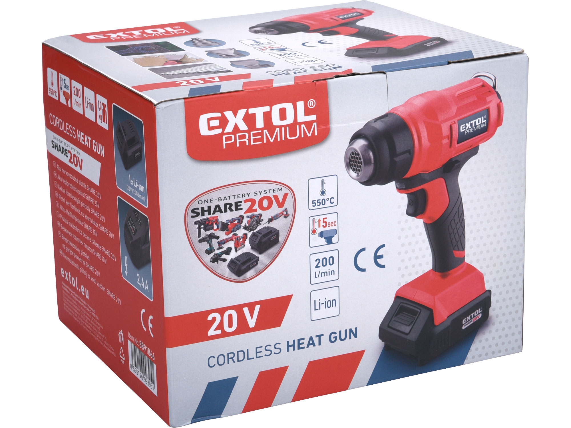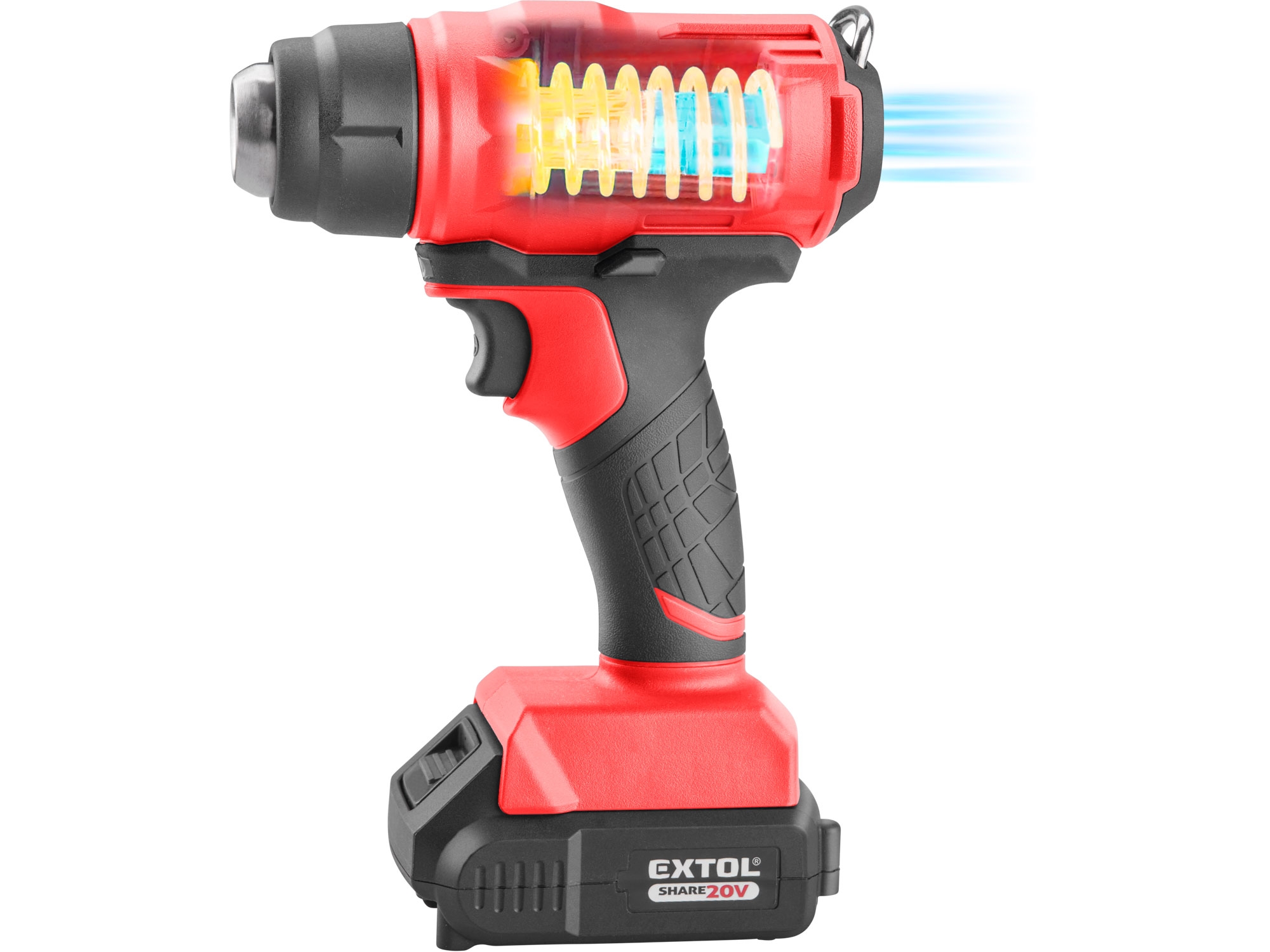Aku horkovzdušná pistole s teplotou vzduchu až 550°C je určena k tvarování, smršťování a spojování umělých hmot, k ohýbání plastových trubek, k uvolňování lepených spojů, dále k rozmrazování zamrzlého potrubí, k odstranění mechu a plevelů ve spárách dlažby, k zapalování grilovacího uhlí, sušení atd. V malém rozsahu lze použít také na odstraňování starých barev a laků. Pistole se nahřeje na provozní teplotu za 5 vteřin od zapnutí díky elektronickému řízení nahřívání. Pro zvýšení životnosti stroje, ventilátor pracuje ještě několik vteřin po uvolnění spínače, aby ochladil topnou spirálu. Pistole je vybaven LED svítilnou, která osvětluje pracovní prostor při práci a háčkem na zavěšení. Součástí dodávky jsou tři vyměnitelné trysky – redukční tryska (úzký proud vzduchu): pro koncentrování proudu vzduchu (tepla) do malého místa, např. pro pájení či ohýbání plexiskla, široká tryska: pro nahřívání širší plochy, trubková tryska: pro nahřívání trubek. Díky integrovanému snímacímu prstenci lze z pistole rychle sejmout horkou koncovku a vyměnit ji za jinou bez vyčkávání na zchladnutí nebo bez použití kleští. Pro běžnou práci dostačují jeden nebo dva 2000mAh akumulátory, které můžete rychle nabít v rychlonabíječce, pro náročnější nebo delší práci doporučujeme větší akumulátory s kapacitou 4000–8000mAh. Akumulátor lze použít ve všech typech nářadí řady EXTOL SHARE20V. Díky použité Li-ion technologii je ho možné kdykoliv dobíjet, aniž by se tím snižovala jeho kapacita. Li-ion akumulátor ztrácí energii vlivem samovybíjení velmi pomalu a vydrží dlouho nabitý a připravený k použití.