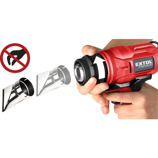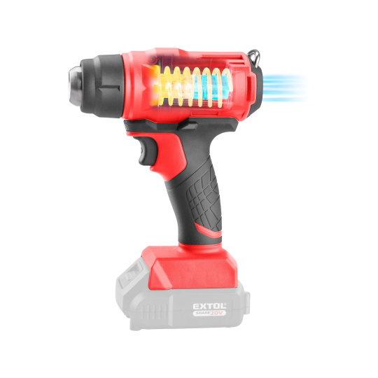 Aku horkovzdušná pistole s teplotou vzduchu až 550°C je určena k tvarování, smršťování a spojování umělých hmot, k ohýbání plastových trubek, k uvolňování lepených spojů, dále k rozmrazování zamrzlého potrubí, k odstranění mechu a plevelů ve spárách dlažby, k zapalování grilovacího uhlí, sušení atd. V malém rozsahu lze použít také na odstraňování starých barev a laků. Pistole se nahřeje na provozní teplotu za 5 vteřin od zapnutí díky elektronickému řízení nahřívání. Pro zvýšení životnosti stroje, ventilátor pracuje ještě několik vteřin po uvolnění spínače, aby ochladil topnou spirálu. Pistole je vybaven LED svítilnou, která osvětluje pracovní prostor při práci a háčkem na zavěšení. Součástí dodávky jsou tři vyměnitelné trysky – redukční tryska (úzký proud vzduchu): pro koncentrování proudu vzduchu (tepla) do malého místa, např. pro pájení či ohýbání plexiskla, široká tryska: pro nahřívání širší plochy, trubková tryska: pro nahřívání trubek. Díky integrovanému snímacímu prstenci lze z pistole rychle sejmout horkou koncovku a vyměnit ji za jinou bez vyčkávání na zchladnutí nebo bez použití kleští. Pro běžnou práci dostačují jeden nebo dva 2000mAh akumulátory, které můžete rychle nabít v rychlonabíječce, pro náročnější nebo delší práci doporučujeme větší akumulátory s kapacitou 4000–8000mAh. Akumulátor lze použít ve všech typech nářadí řady EXTOL SHARE20V. Díky použité Li-ion technologii je ho možné kdykoliv dobíjet, aniž by se tím snižovala jeho kapacita. Li-ion akumulátor ztrácí energii vlivem samovybíjení velmi pomalu a vydrží dlouho nabitý a připravený k použití.