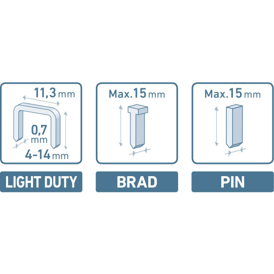 možnost nastavení síly úderu, vhodné pro spony: výška 4-14mm, rozteč 11,3x tl.0,75mm, hřebíky s hlavičkou i bez hlavičky do max. délky 15mm
