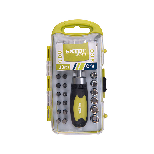 (-) 4-5,5-7mm, PH 0-1-2, PZ 1-2, HEX 4-5-6mm, T 10-15, hlavice 5-6-7-8-9-10mm, mini hroty: (-) 2-2,5-3mm, PH 000-00-0, T 6-8, adaptér mini hroty 5/32", redukce na hlavice 1/4", ráčnový šroubovák zakončený 1/4" šestihranem