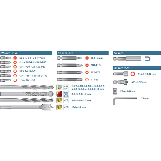 vrtáky do kovu(HSS-4241) : O 1,5-1,5-2-2-2,5-2,5-3-3,2-3,5-4-4,5-4,8-5-5,5-6-6,5-7-8-10mm; vrtáky do dřeva(HCS): O 3-4-5-6-8-10-13-16-19mm; vrtáky do zdiva(SK-YG8C): O 3-4-5-6-8-10mm; hroty 1/4"x25mm: (-) 3-4-5-5-6-6-7-7mm, PH0-0-1-1-2-2-3-3, PZ0-0-1-1-2-2-3-3, HEX H3-4-5-6-7mm, TORX T10-10-15-15-20-20-25-25-27-27-30-30, SQ 1-1-2-2-3-3; hroty 1/4"x50mm: (-) 5-6mm, PH2-3, PZ2-3, T15-20; nástrčné hlavice (38mm): 5-6-8-10-12mm; magnet.nástavec na hroty 1/4"x59mm; záhlubník 1/4"x45°x12mm; hloubk. dorazy k vrtákům O3-6-8-10mm; L-imbus 2,5mm