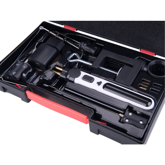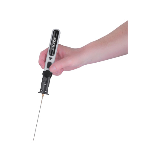 Aku řezačka se sadou řezacích nástavců je určena pro zkracovací, vyřezávací, drážkovací a tvarovací řezné práce v pěnových deskách jako je např. pěnový polystyren, pěnový polyethylen apod. S touto aku řezačkou můžete doma nebo ve škole vytvářet drobné pěnové řemeslné a kutilské projekty. Řezací struna se zahřeje na 100℃ za přibližně 12 sekund a na pracovní teplotu 550℃ přibližně za 30 sekund. Nástroj je vybaven vestavěným LED světlem, které zajišťuje lepší viditelnost a přesnost při řezání i za zhoršených světelných podmínek. Struna na vidlici se používá např. pro jemné a přesné vyřezávání, např. ze silného polystyrenu. Řezací nůž je určen pro vyřezávání větších tvarů v ploše nebo ke zkracování polystyrenu. "U" nůž se používá k "dlabání" neprůchozích dutin v polystyrénu. Pájecí nástavec se používá např. jako pero k psaní textu nebo kreslení do polystyrenu a také lze použít k pájení plastů nebo po nasazení měděných špiček pro měkké pájení. Pro zjednodušení práce lze řezačku pomocí přiloženého držáku upnout na stůl a poté mít obě ruce volné pro manipulaci s materiálem při řezání. Nástroj se nabíjí pomocí standardního USB-C kabelu z jakékoliv USB nabíječky nebo počítače. Plné nabití trvá 3-4 hodiny. Nástroj je uložen v pevné plastové krabici spolu s držákem, USB kabelem a dalším příslušenstvím. Díky Li-ion akumulátoru je možné pistoli kdykoliv dobíjet, aniž by se tím snižovala kapacita akumulátoru. Li-ion akumulátor ztrácí energii vlivem samovybíjení velmi pomalu a vydrží dlouho nabitý.