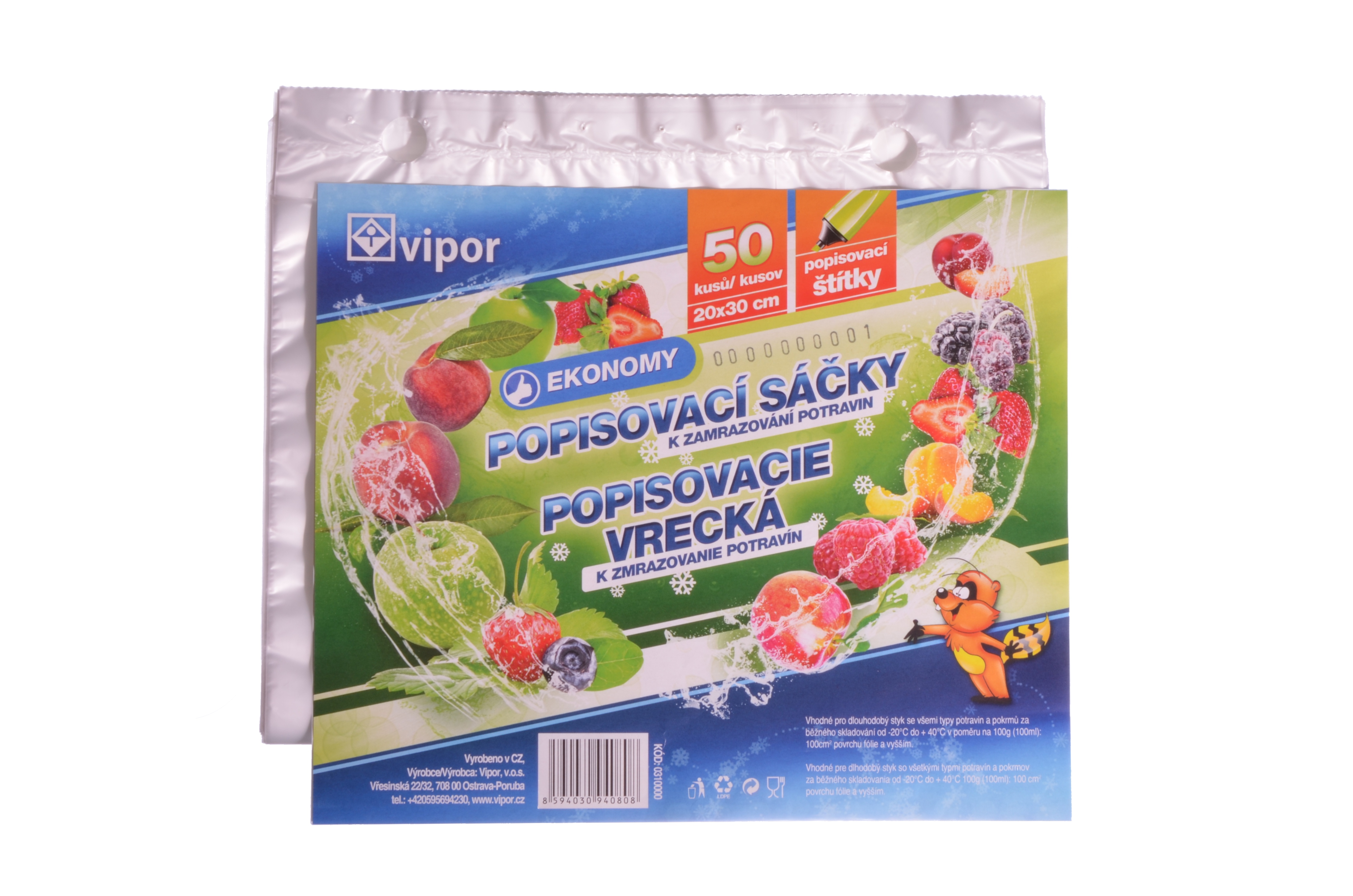 Balené sáčky s etiketou vhodné pro další prodej. Jsou vhodné k balení potravin, ovoce, zeleniny, masných výrobků. Jsou odolné proti roztržení a vodě. Jsou opatřeny štítkem pro popis před zamražením .